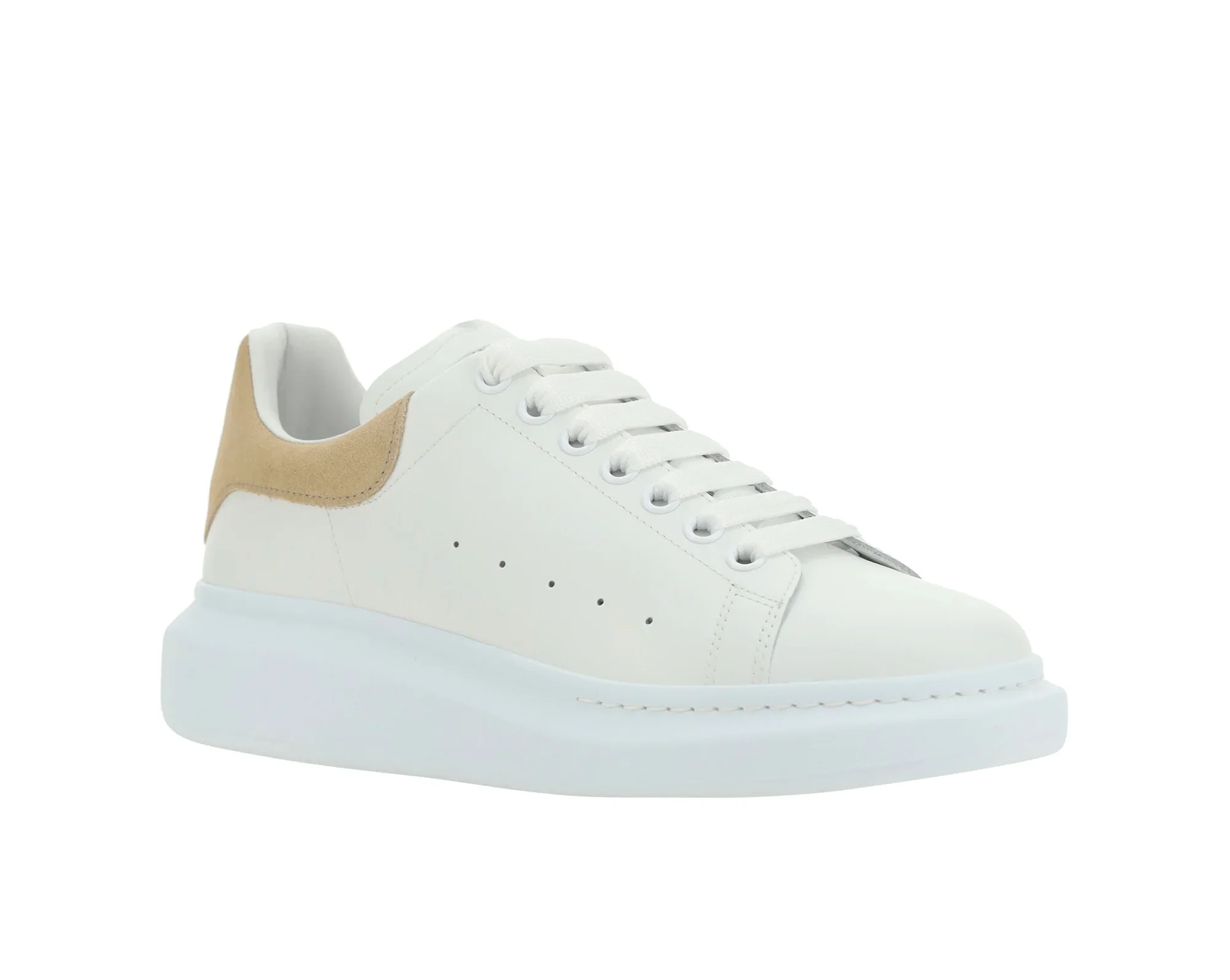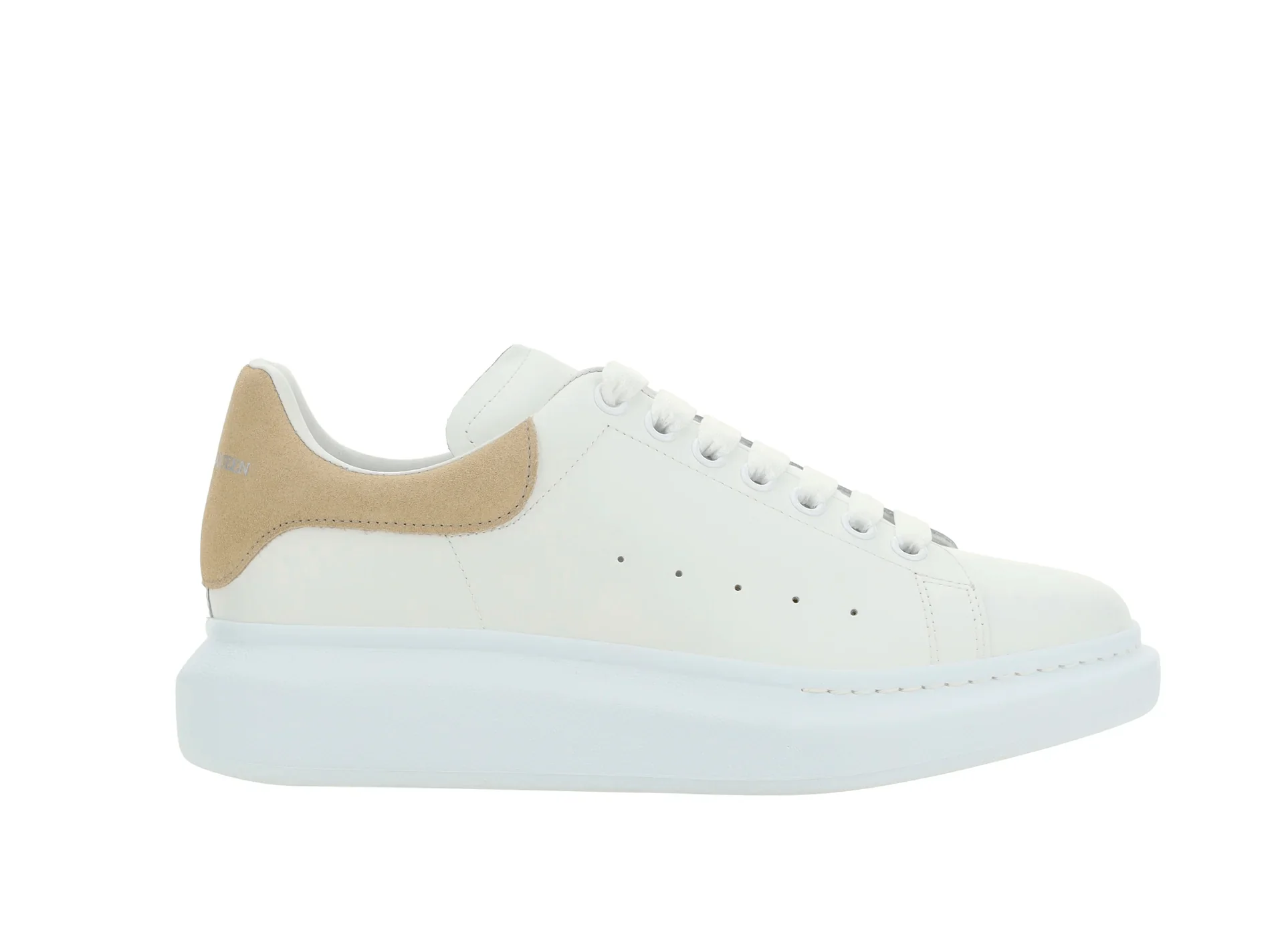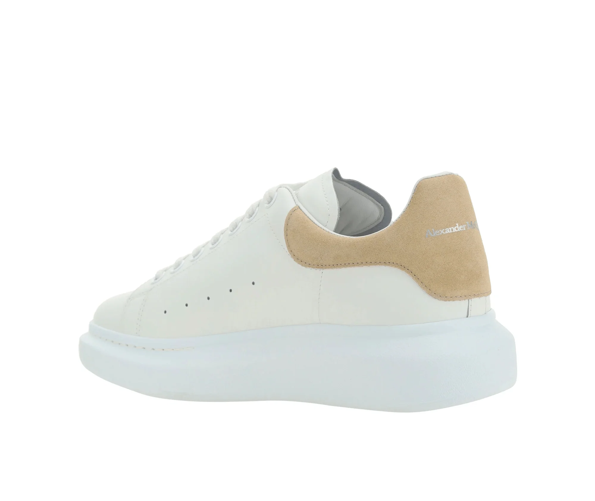 Baskets à lacets, blanches en cuir lisse et bout rond rehaussées d’un détail en daim camel sur le talon. Larges lacets plats, signature Alexander McQueen sur la languette et le contrefort. Semelle oversize en caoutchouc. Afin de réduire notre impact sur l’environnement ainsi que la consommation de coton, nos sneakers ne seront plus accompagnées d’un dustbag.