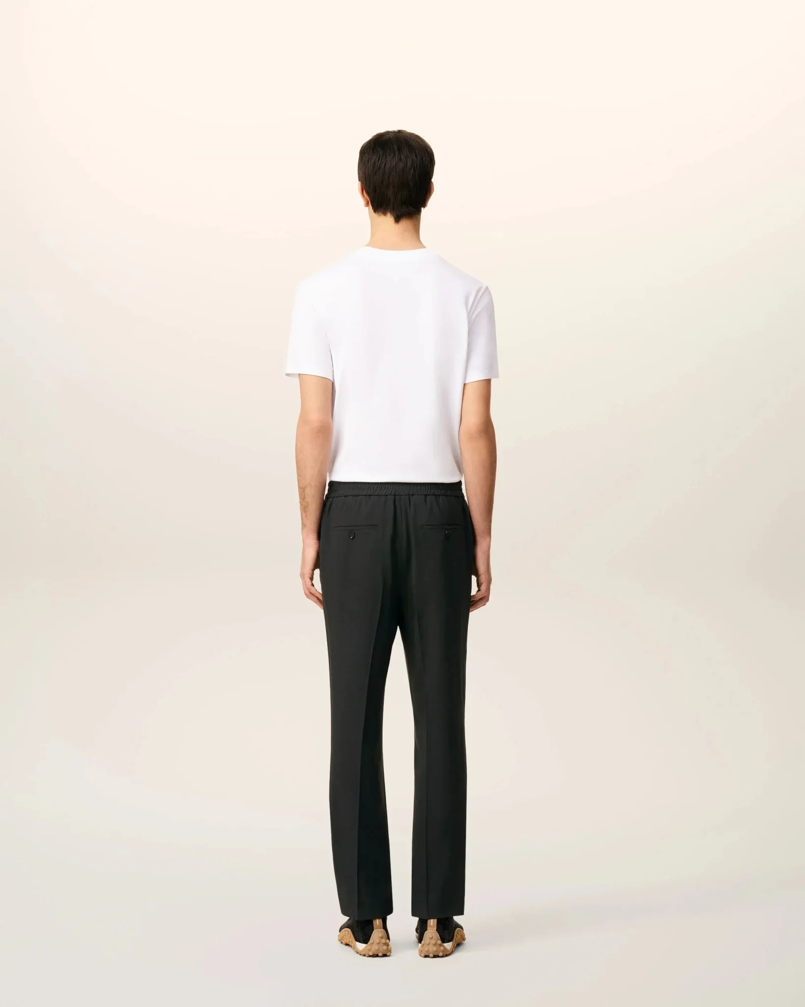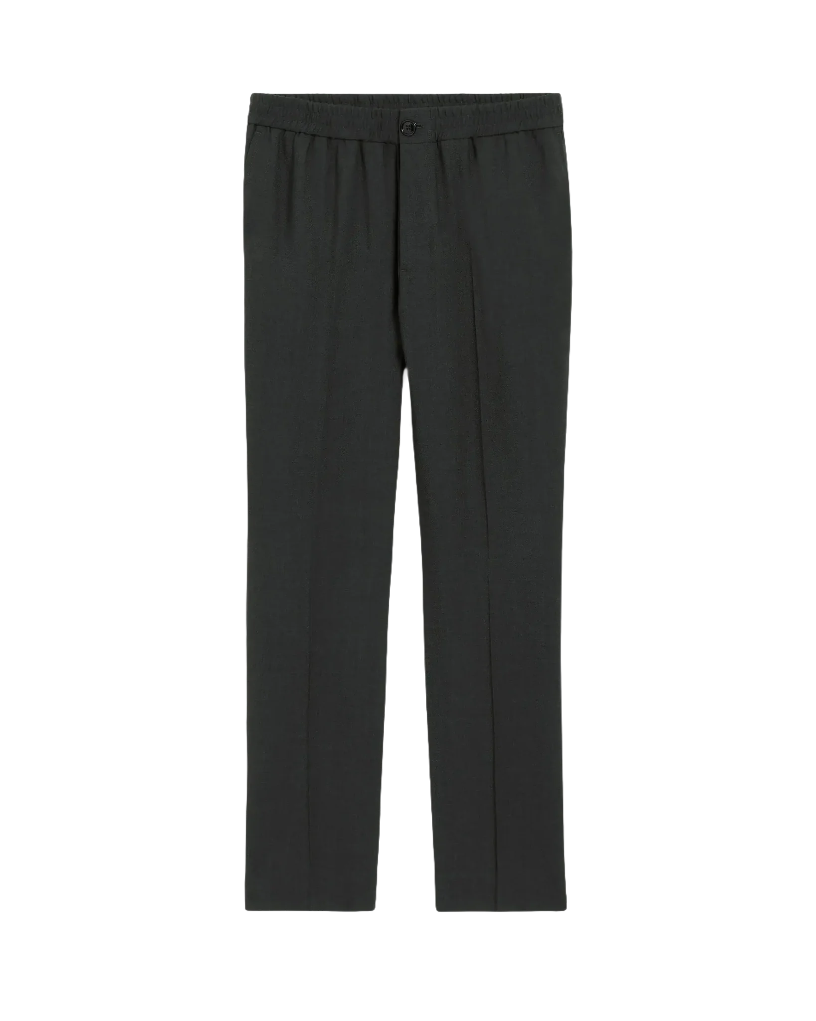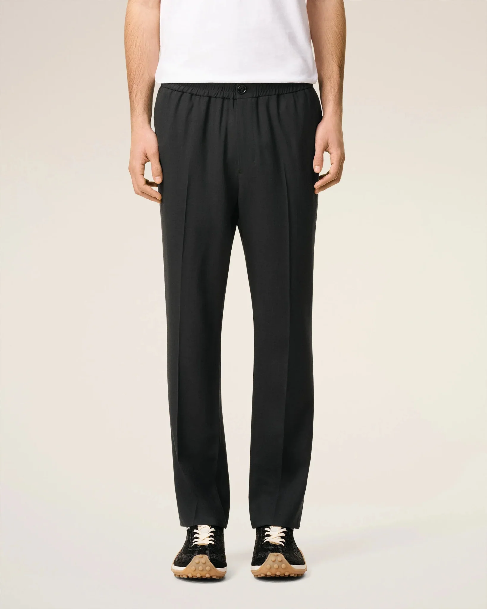Pantalon taille élastiquée en sergé de laine légère.