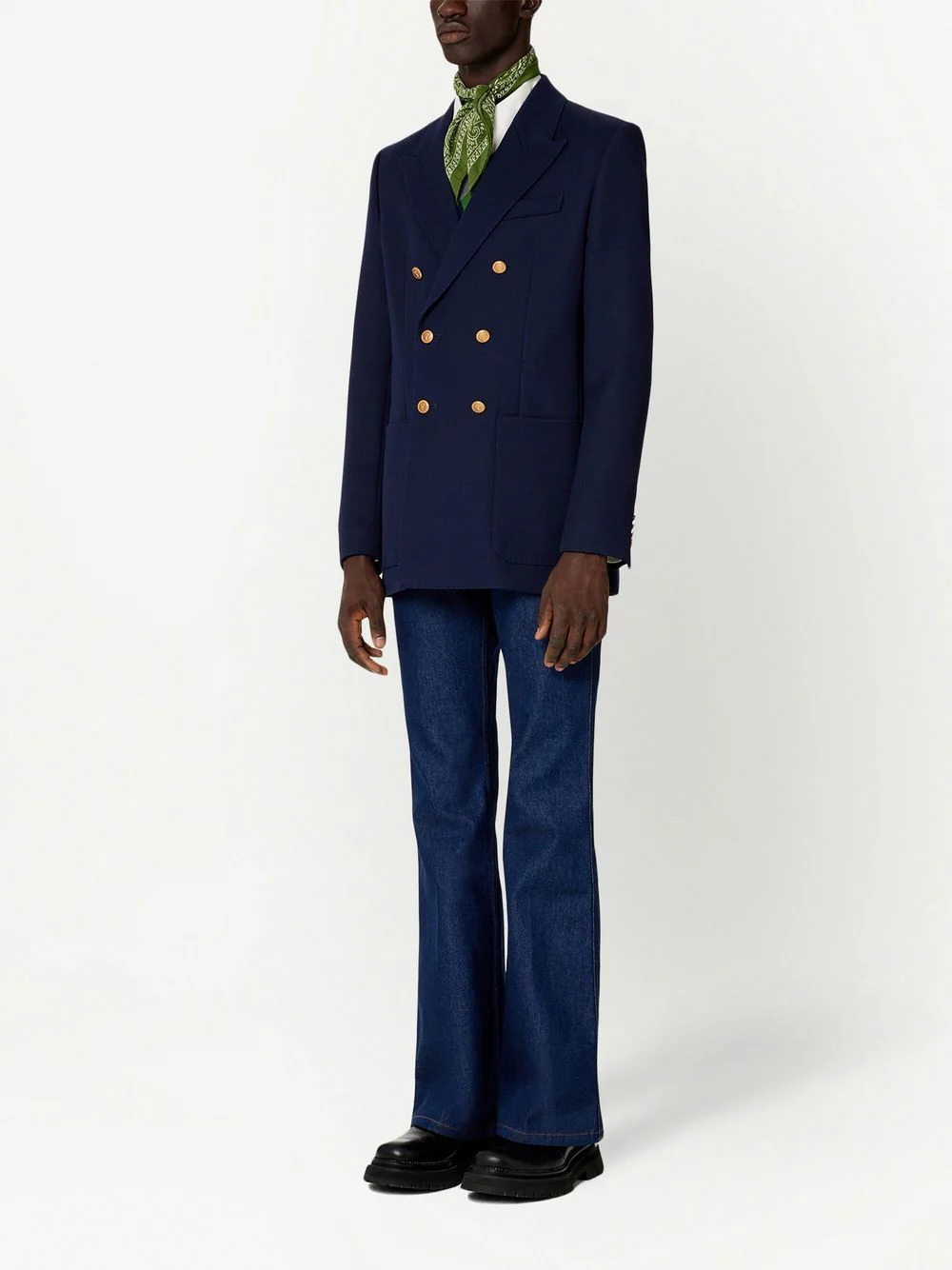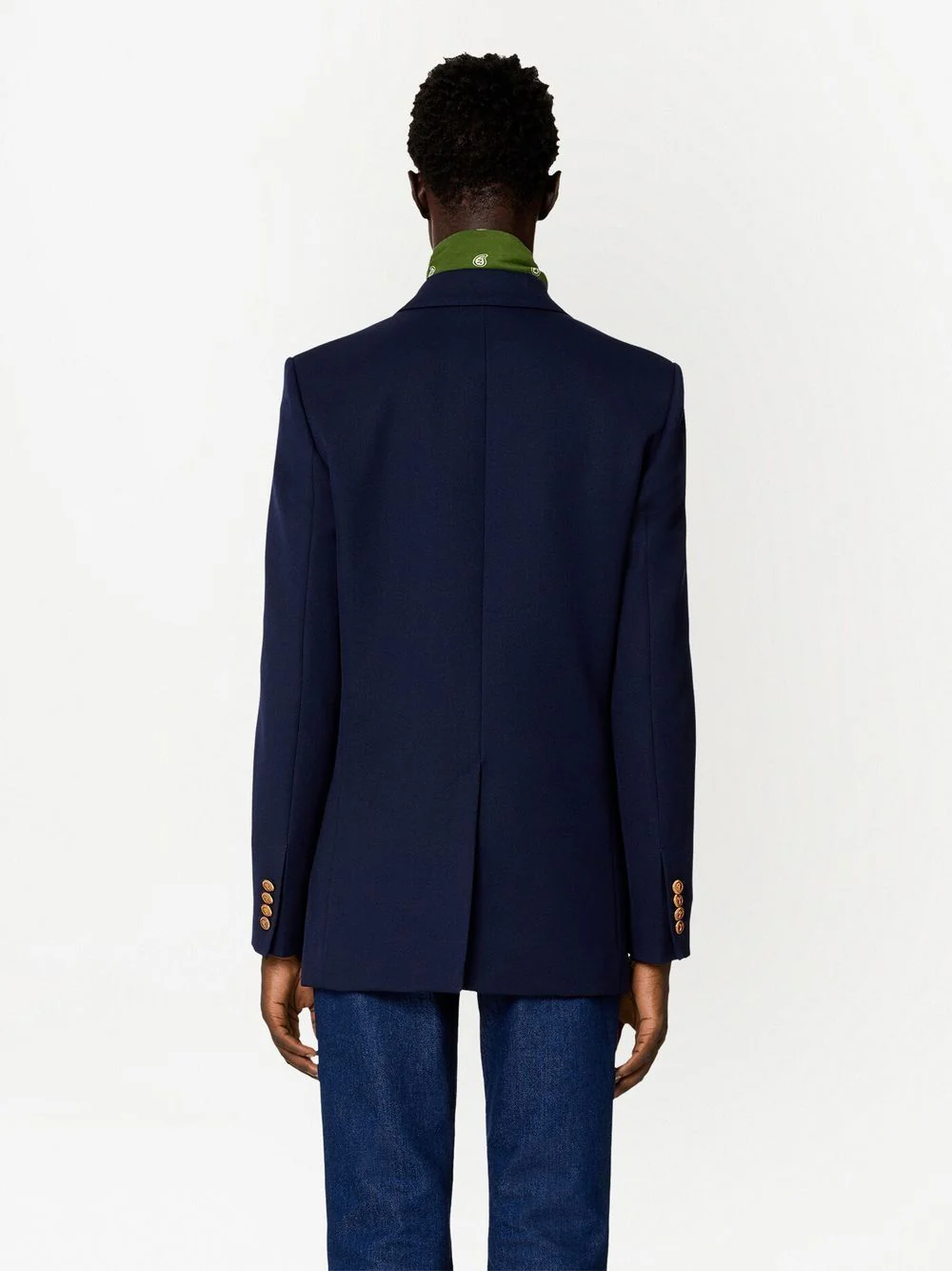 Bleu marine, laine vierge, boutons dorés, boutonnière croisée, revers pointus, manches longues, poche passepoilée sur la poitrine, poches latérales kangourou.