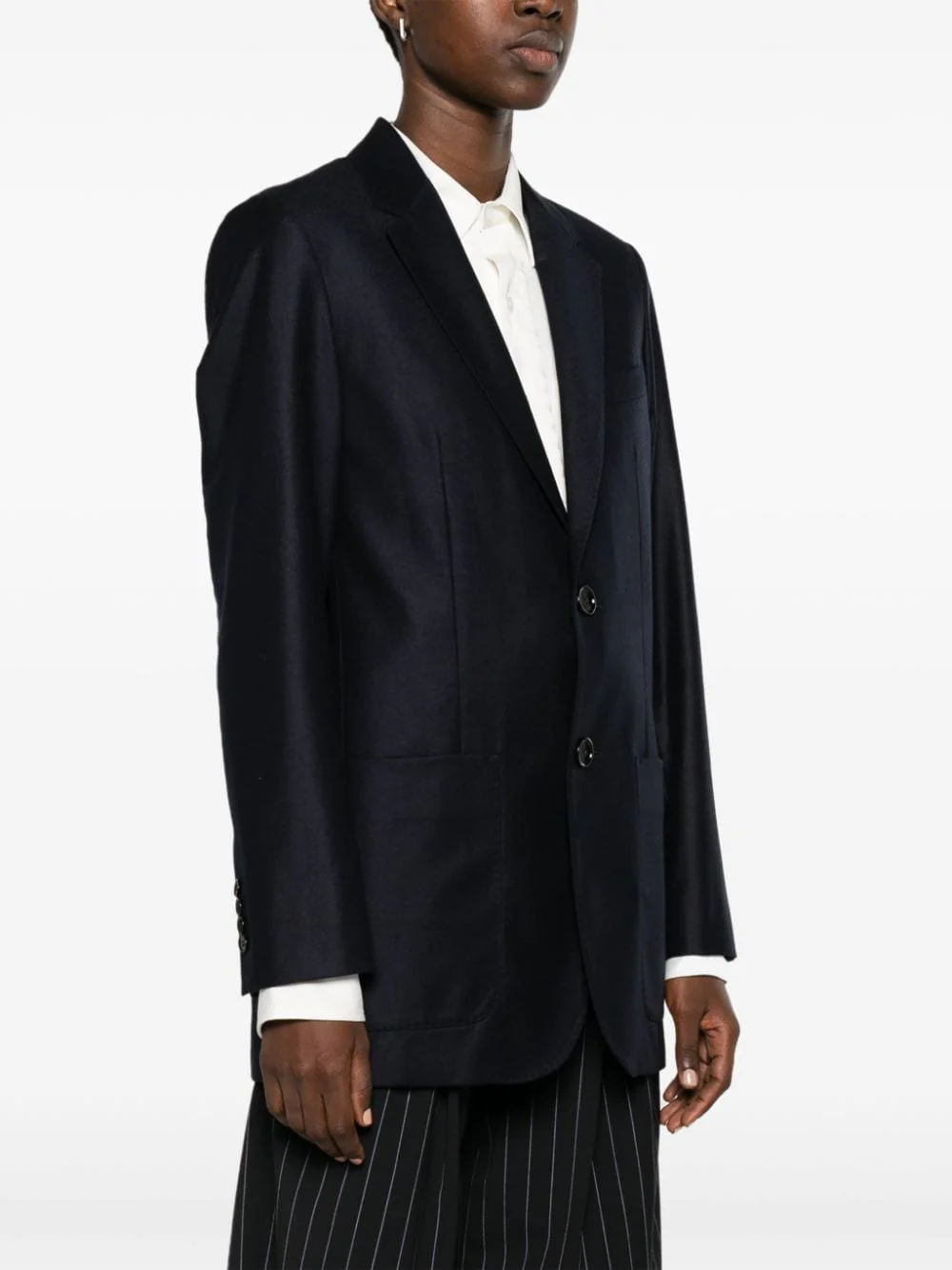 Bleu nuit, laine vierge, pinces, revers crantés, boutonnière sur le devant, épaulettes, manches longues, poignets boutonnés, poche passepoilée sur la poitrine, deux poches plaquées avant, fente arrière, ourlet droit, doublure intégrale.