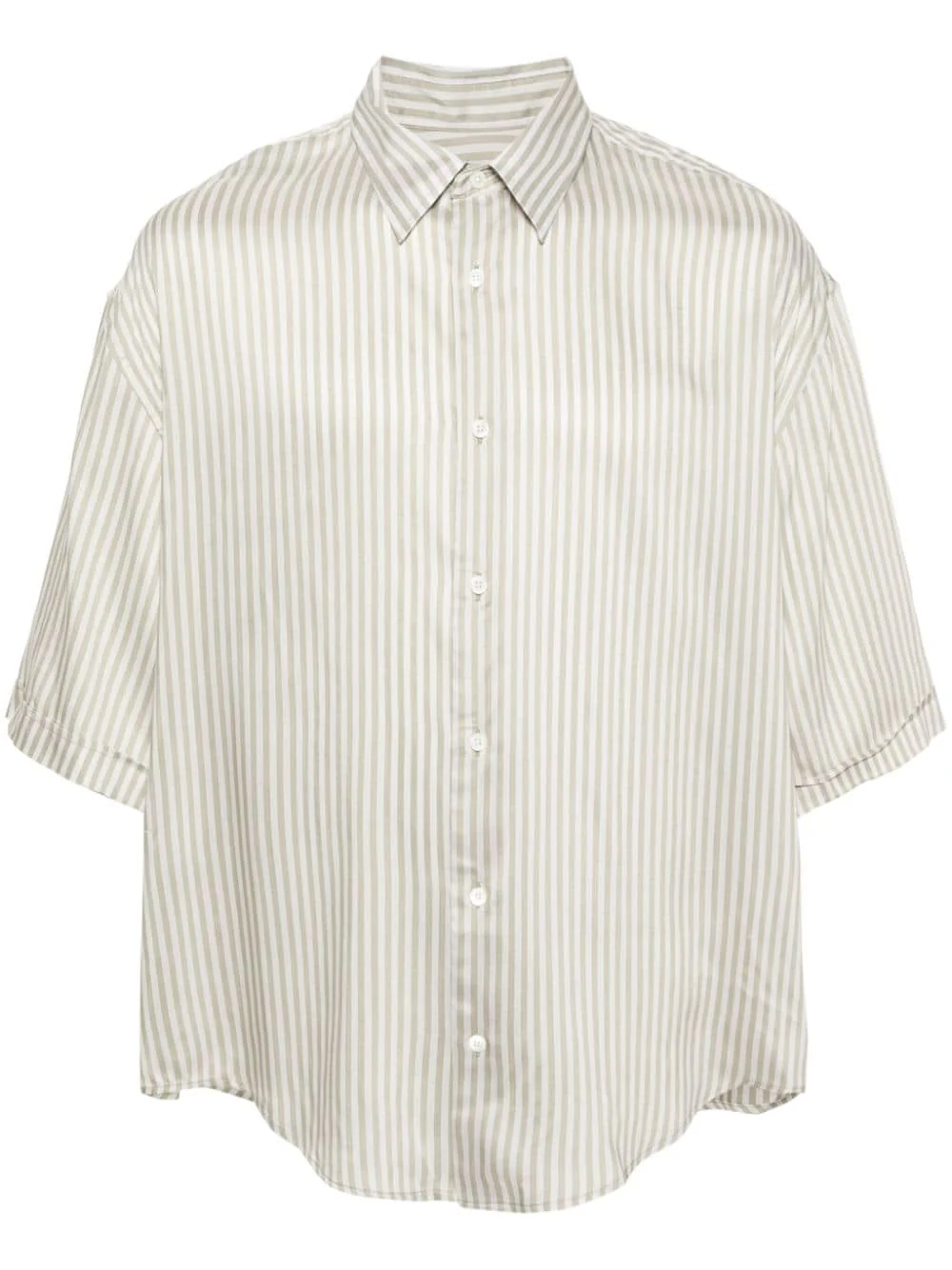 Chemise à motif Ami de Coeur beige clair/vert sauge rayures verticales motif Ami de Coeur signature au dos col pointu plat manches courtes ourlet incurvé boutonnière sur le devant viscose 82%, soie 18% Nettoyage à sec uniquement Le mannequin mesure 1,84 m et porte une taille L ID de la marque : hsh226.vi0015 1931 craie/sauge