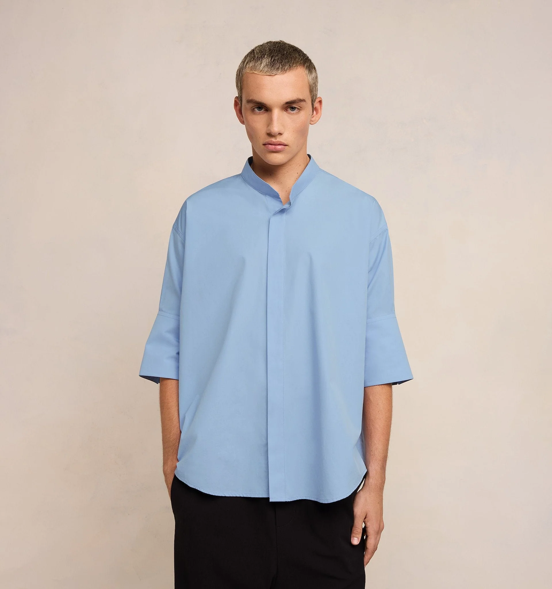 Chemise col mao et manche trois quarts en popeline de coton.