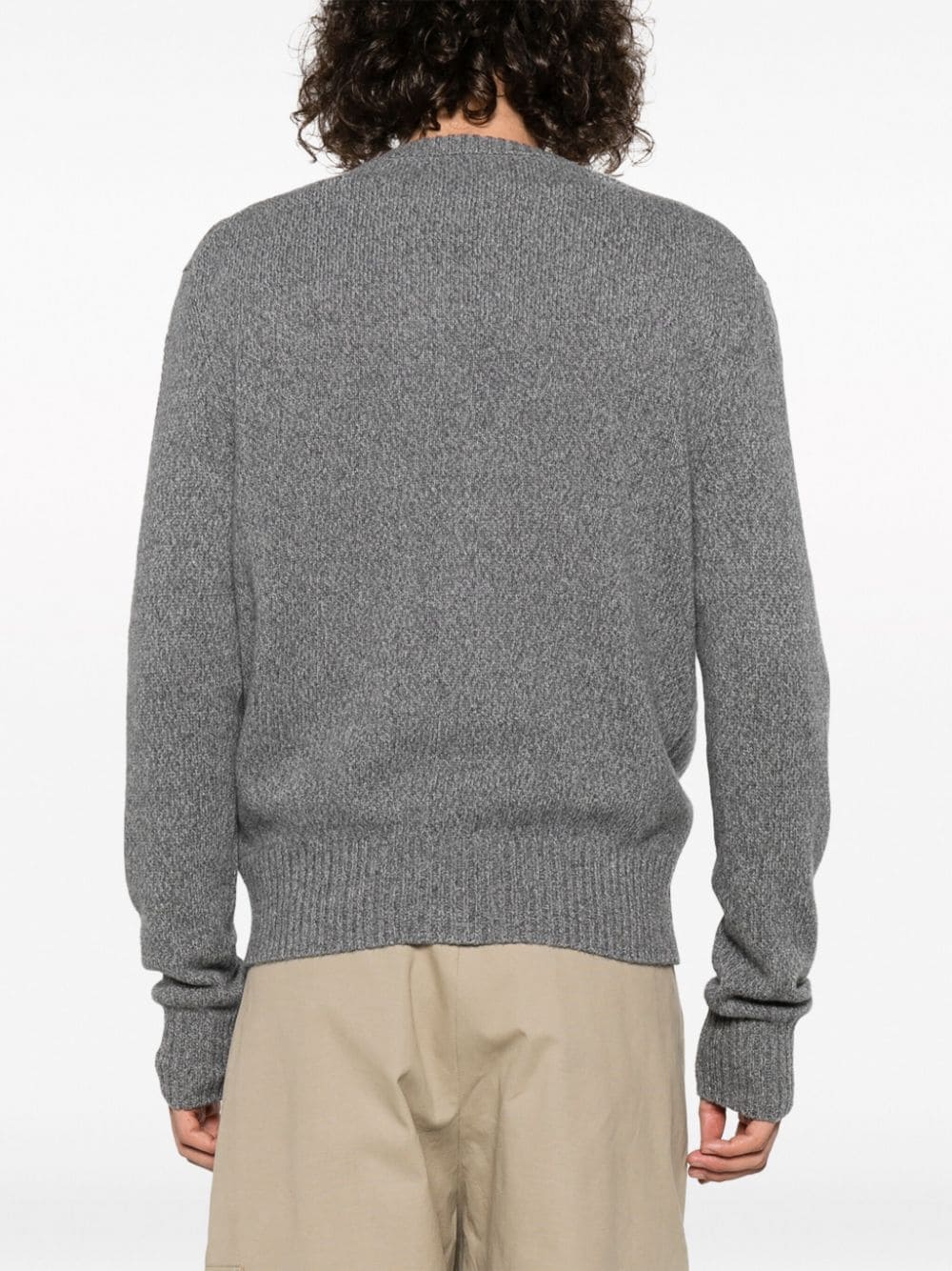 Gris médium, cachemire et laine mélangés, maille nervurée, effet chiné, boutonnière sur le devant, manches longues, ourlet droit.