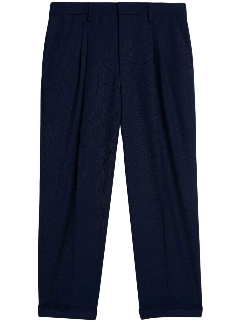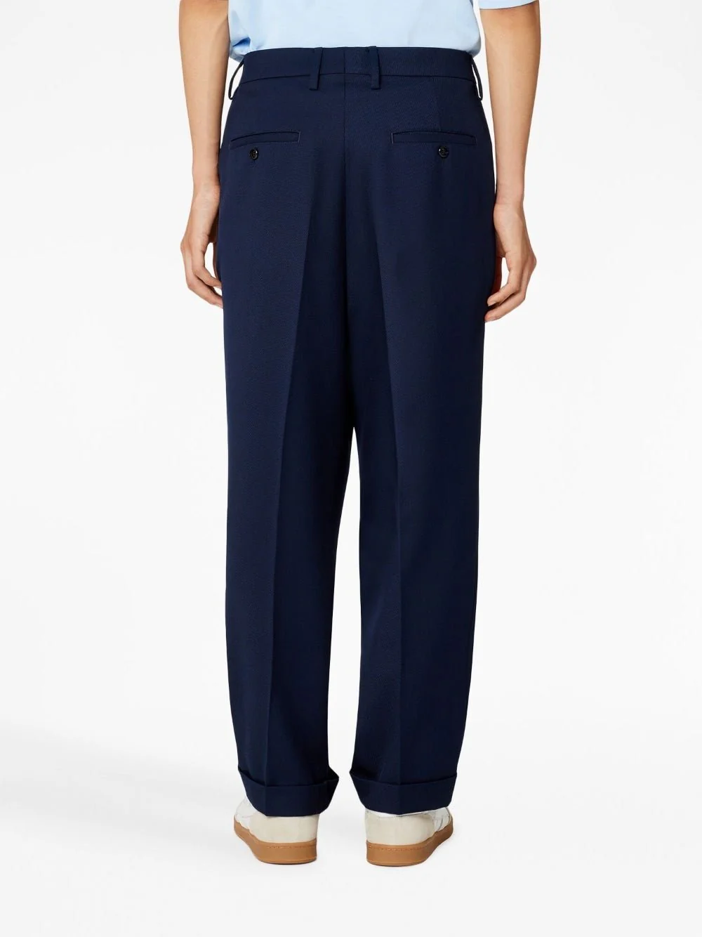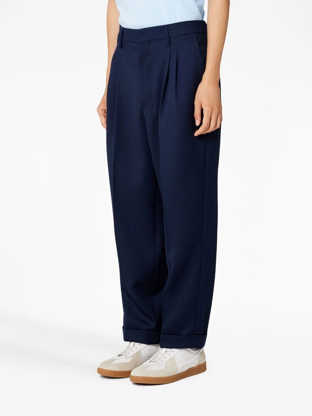 Bleu marine, design plié, fermeture dissimulée sur le devant, taille haute, deux poches latérales fendues, deux poches passepoilées boutonnées à l’arrière, coupe ample, passants de ceinture, ourlet droit.
