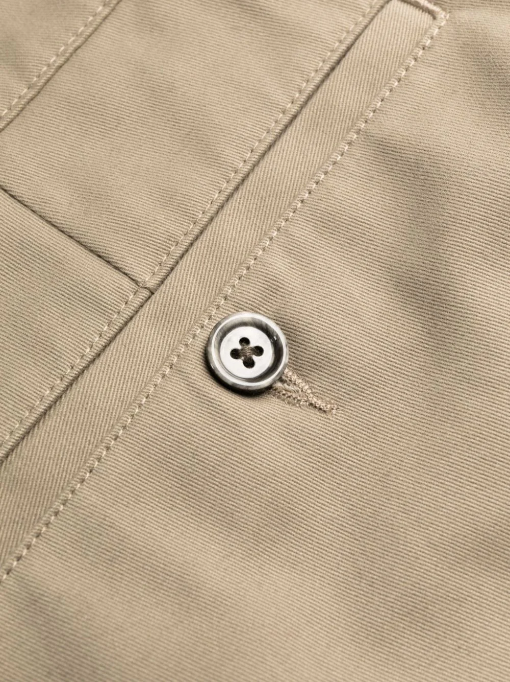 Taupe, coton, passants de ceinture, plis marqués, boutonnière sur le devant, taille mi-haute, coupe droite, poches latérales fendues, deux poches passepoilées boutonnées à l’arrière.