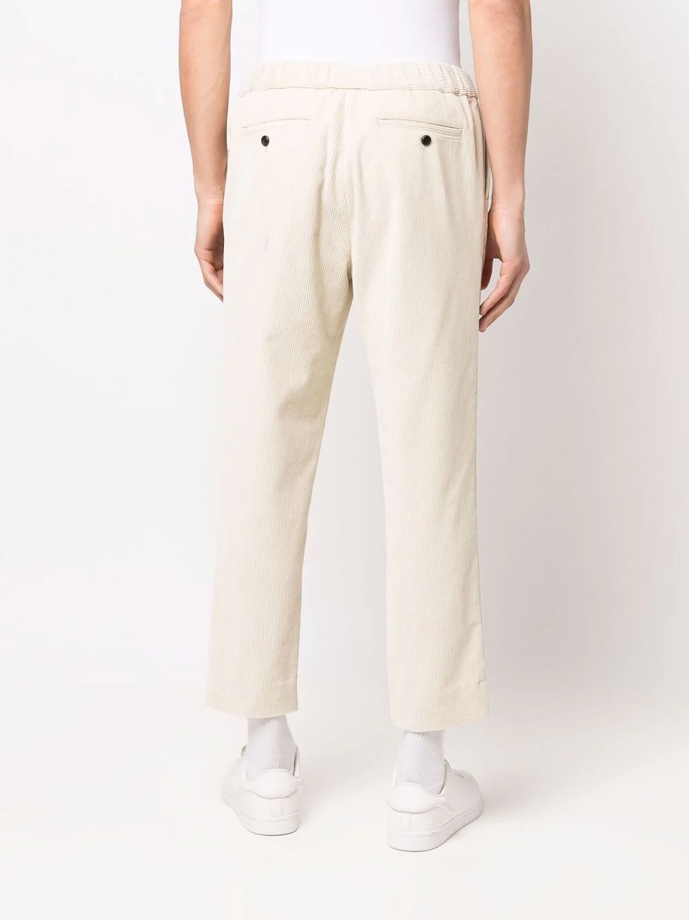 Velours côtelé, taille élastique à lien de resserrage, poches latérales fendues, deux poches passepoilées boutonnées à l’arrière. Couleur : beige. Matière : coton.