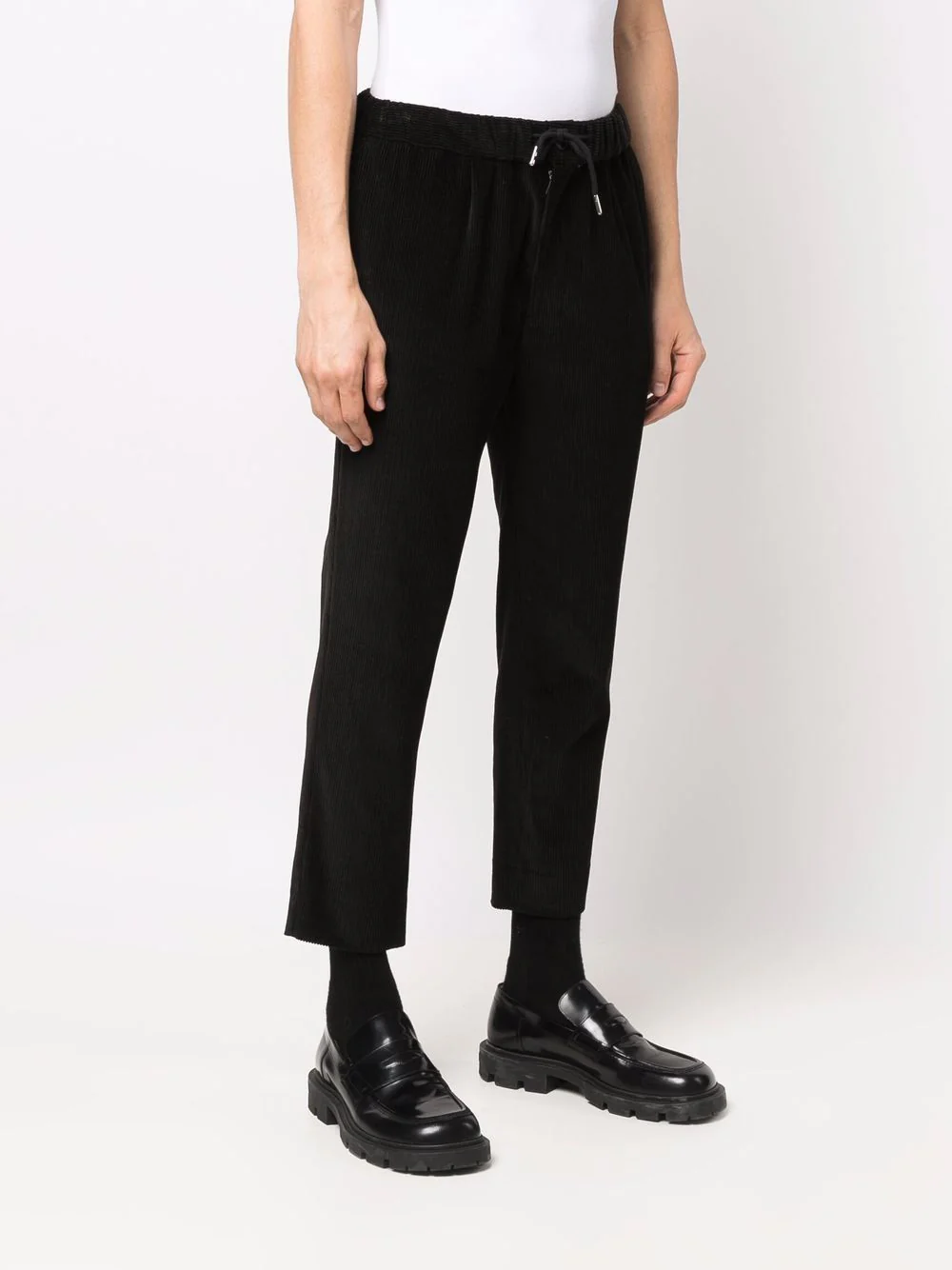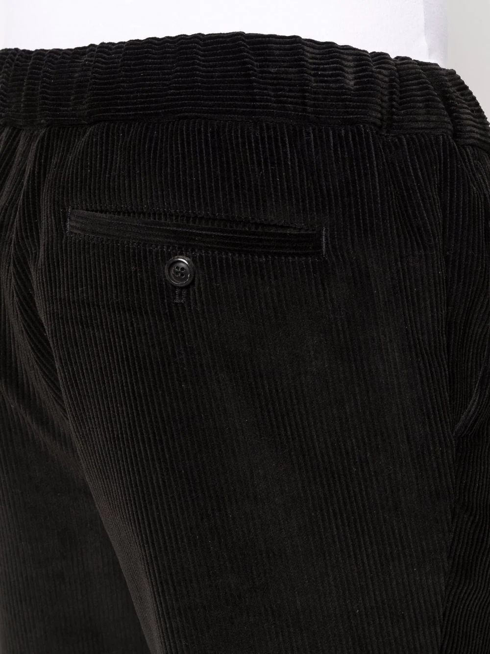 Velours côtelé, taille élastique à lien de resserrage, poches latérales fendues, deux poches passepoilées boutonnées à l’arrière. Couleur : Noir. Matière : coton.