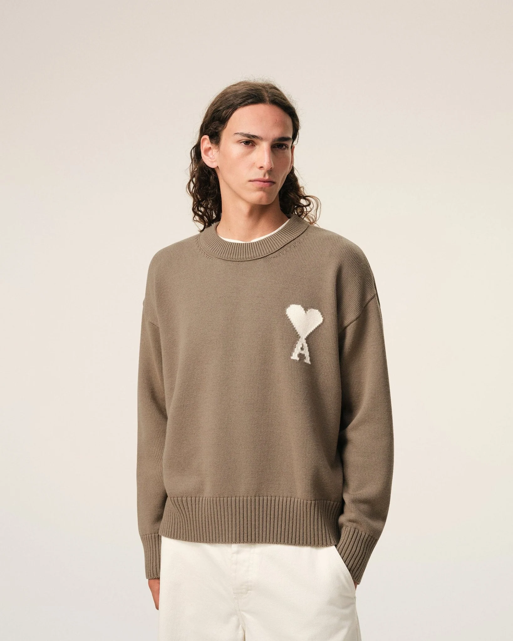 AMI PARIS – Pull Col Rond Ami De Coeur en Laine Et Coton Beige taupe