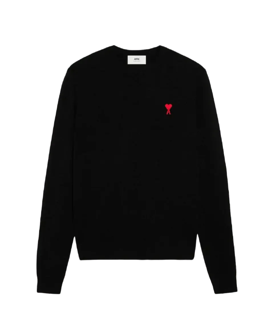 Noir de jais, rouge écarlate, laine, design en maille, logo brodé sur la poitrine, finitions nervurées, encolure ronde, manches longues, ourlet droit.