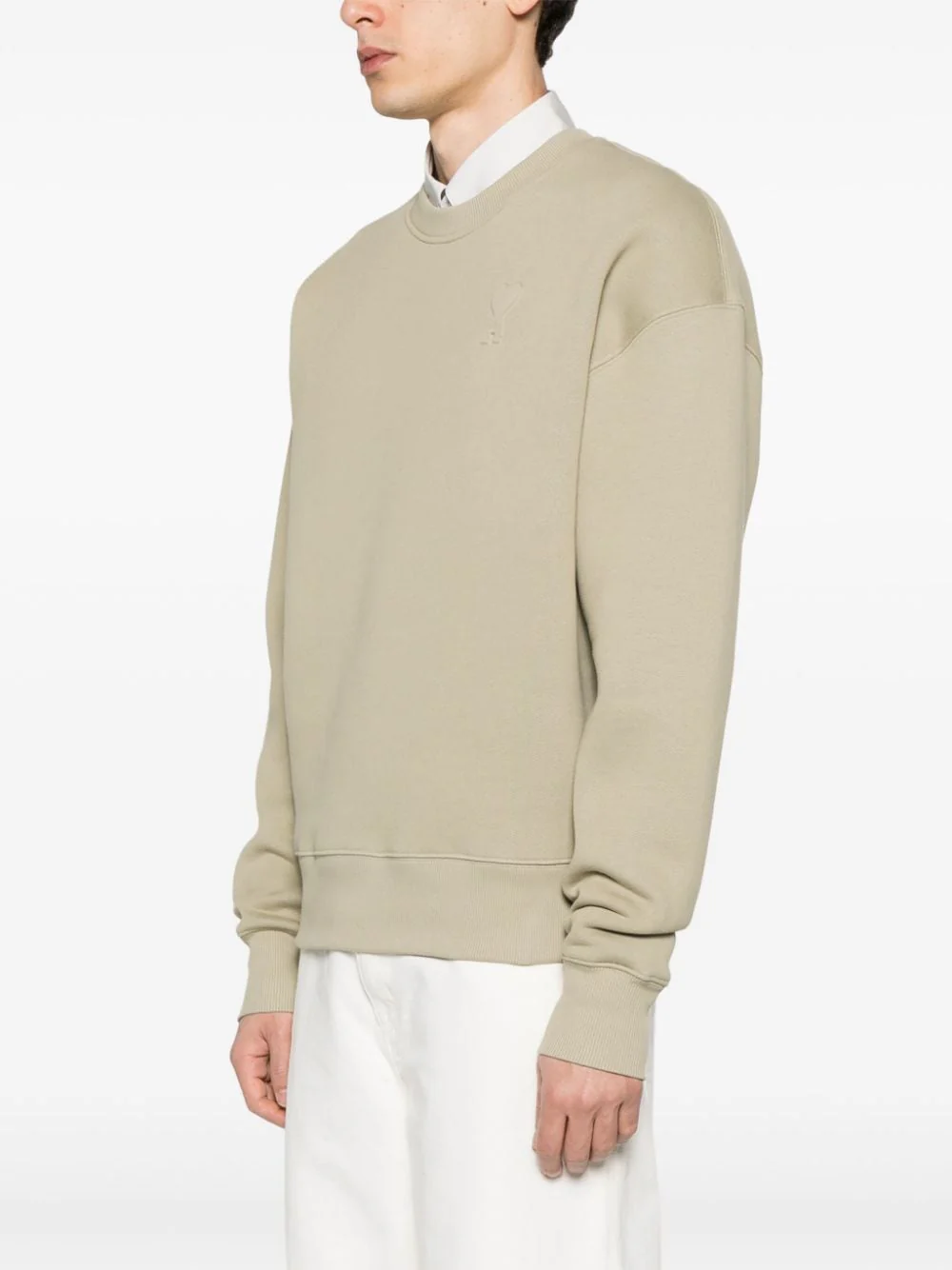 Texture jersey de coton mélangé vert sauge signature embossé Ami de Coeur monogramme col rond épaule tombante manches longues poignets et ourlet côtelés ourlet droit doublure polaire