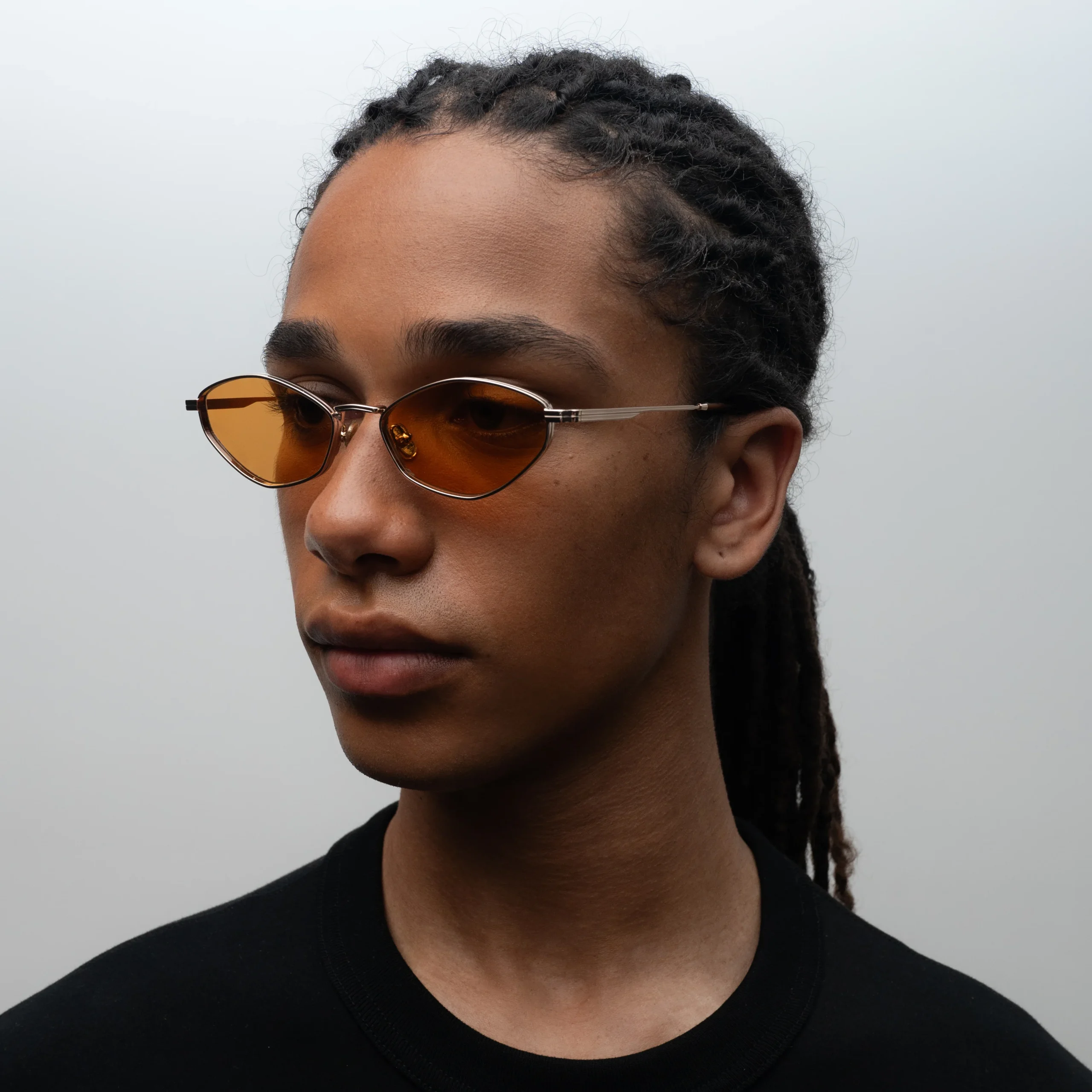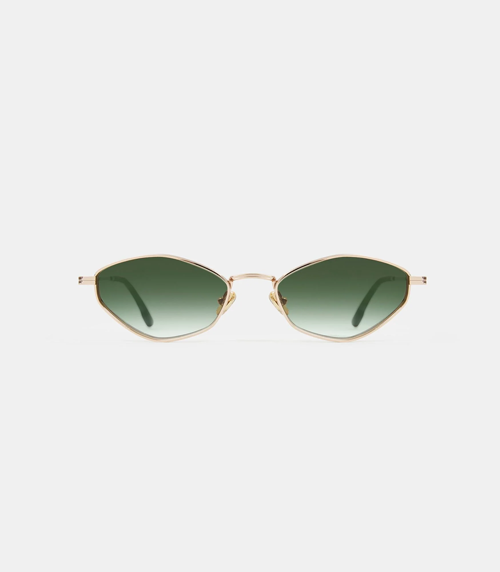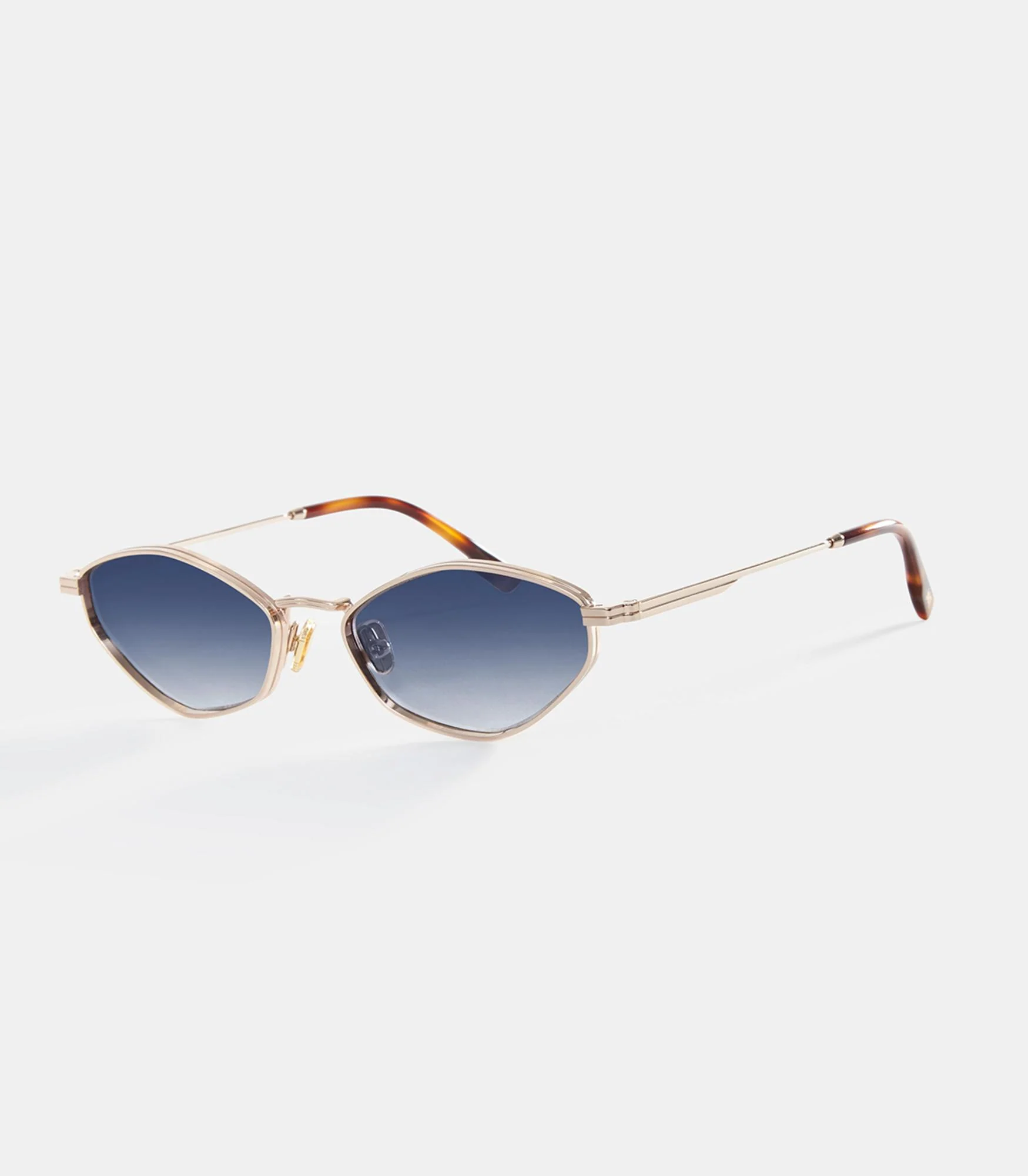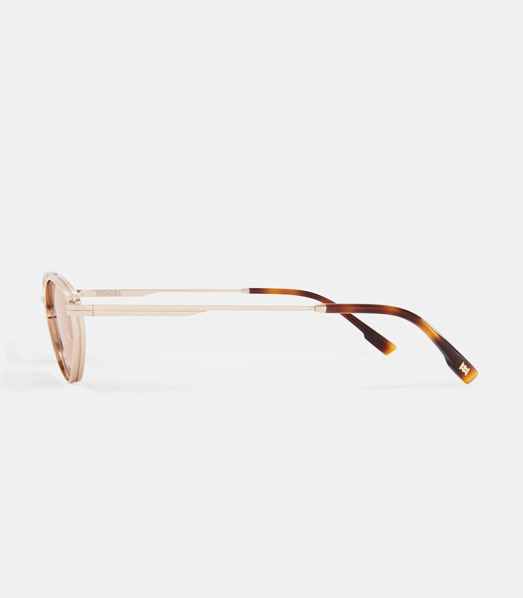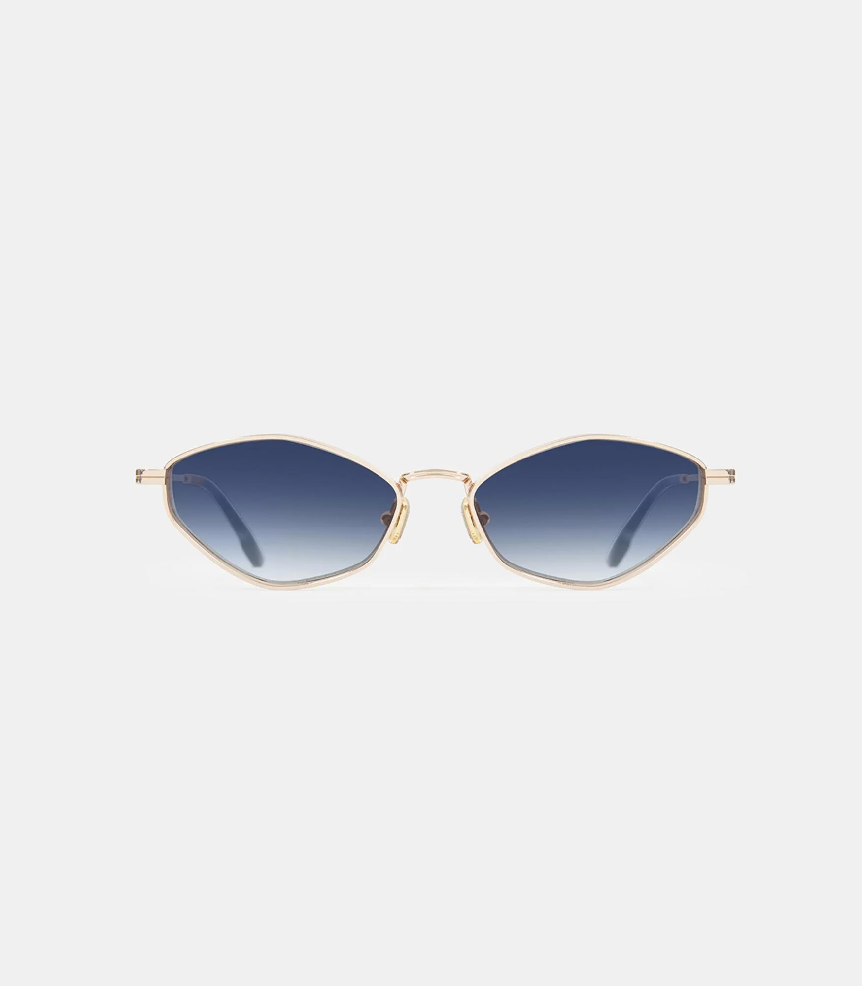 Monture métallique de forme cat-eye. Fines branches avec manchons en acétate, et déport sur la face avant du verre.