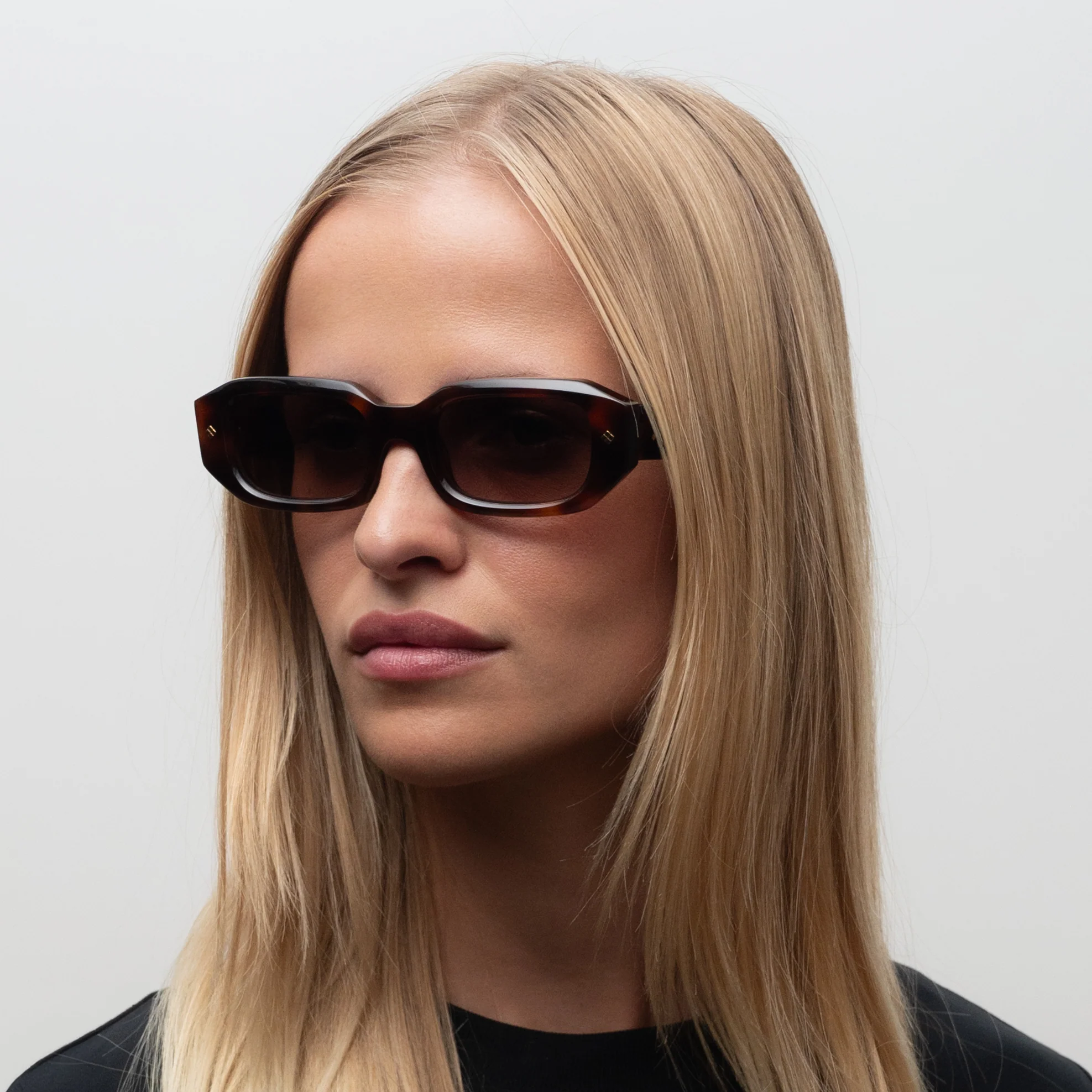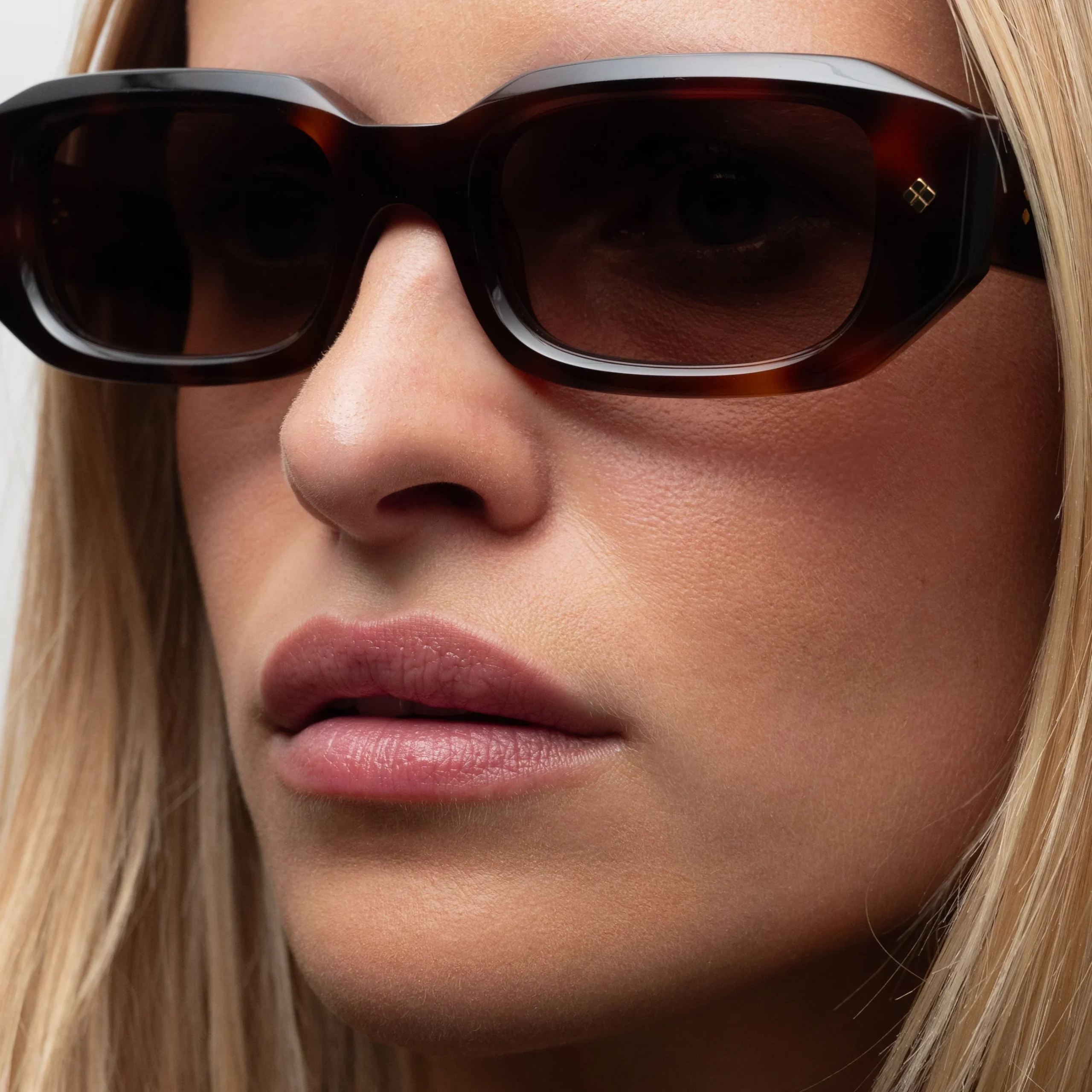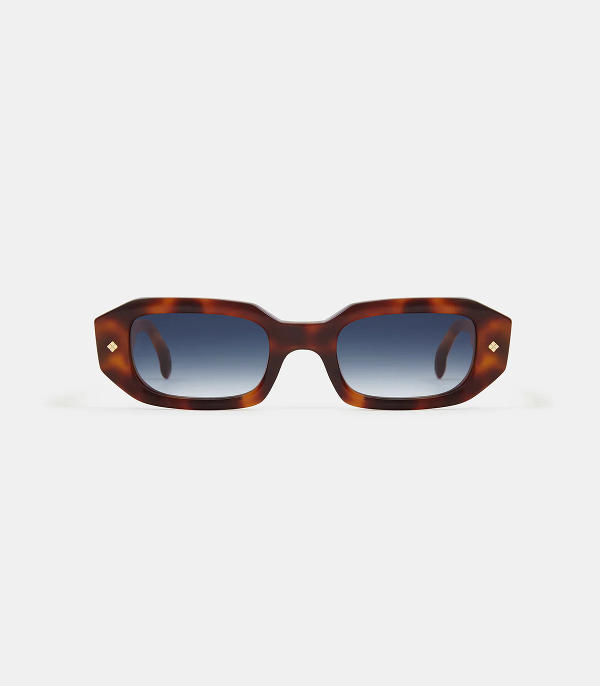 Monture en acétate Mazzucchelli de forme hexagonale. Rivets carrés apparents sur les bords et sur les branches, ainsi que détails de pictogrammes gravés.