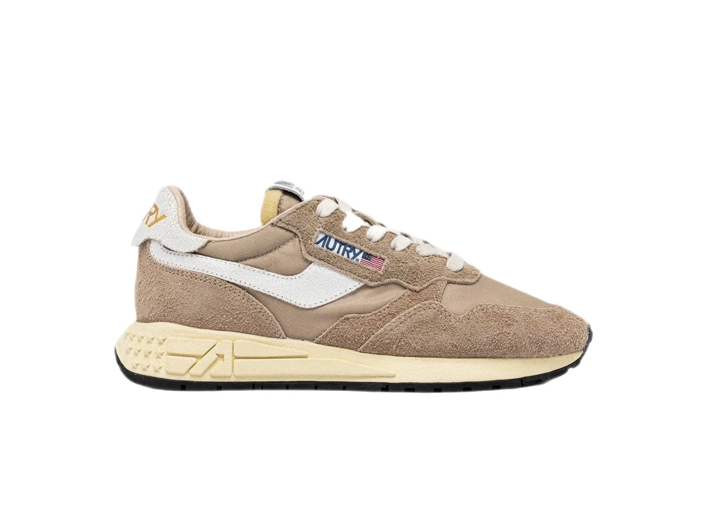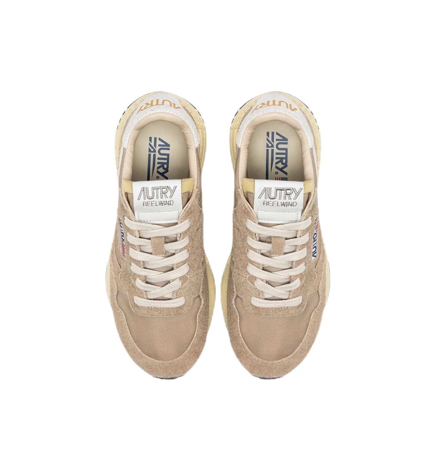 Performance sportive et art de vivre métropolitain. La Sneakers Reelwind pour homme explore le dynamisme de la rue avec une construction à empiècements qui combine du nylon et du daim beige ton sur ton avec des empiècements en cuir craquelé blanc.