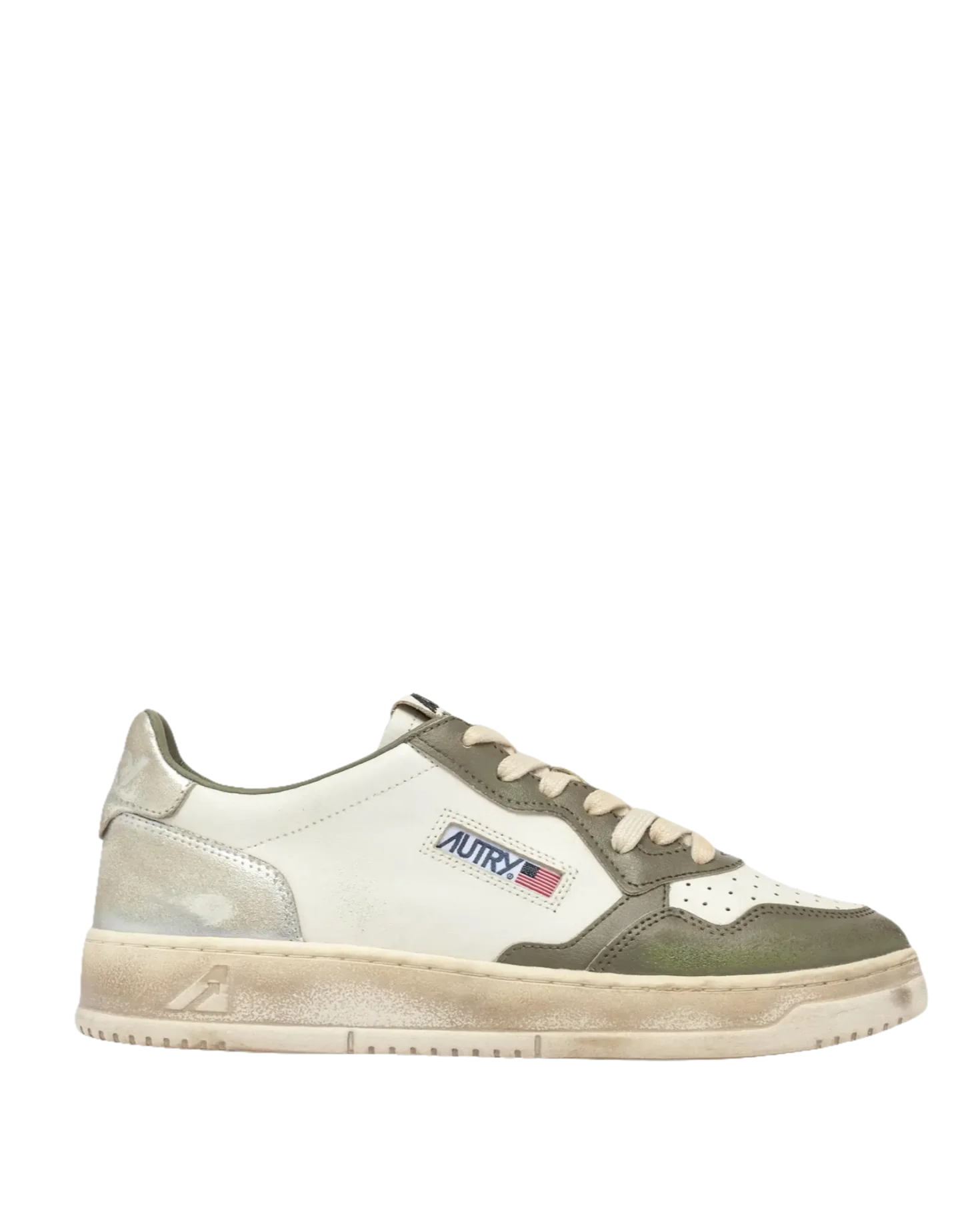 Cette basket pour homme est fabriquée en cuir souple avec un aspect usé qui combine des nuances de blanc, de vert armée et d’argent métallisé. L’insert latéral attire l’attention sur le logo Autry caractéristique. Le traitement exclusif utilisé pour créer le look vintage est entièrement fabriqué en Italie.