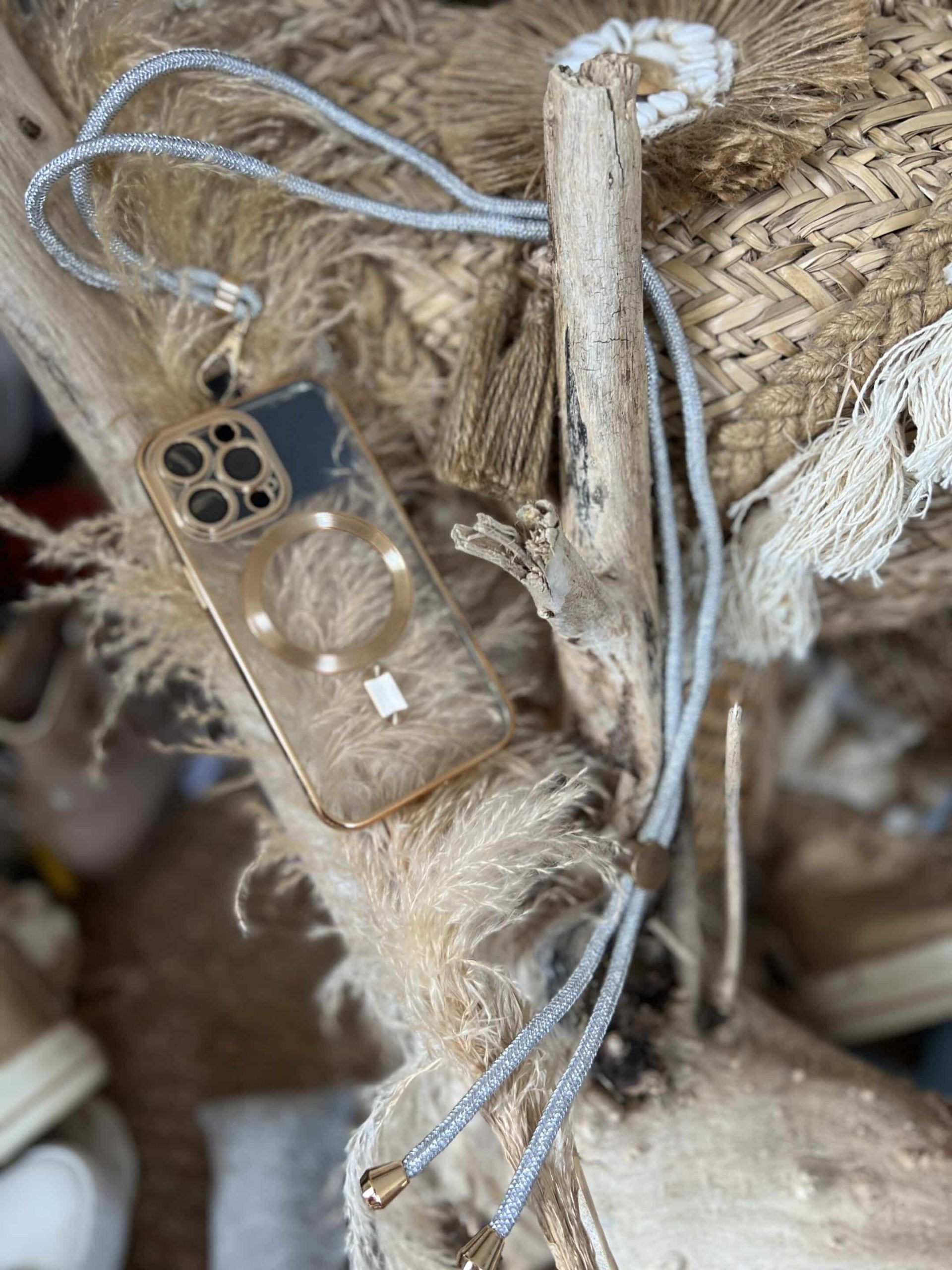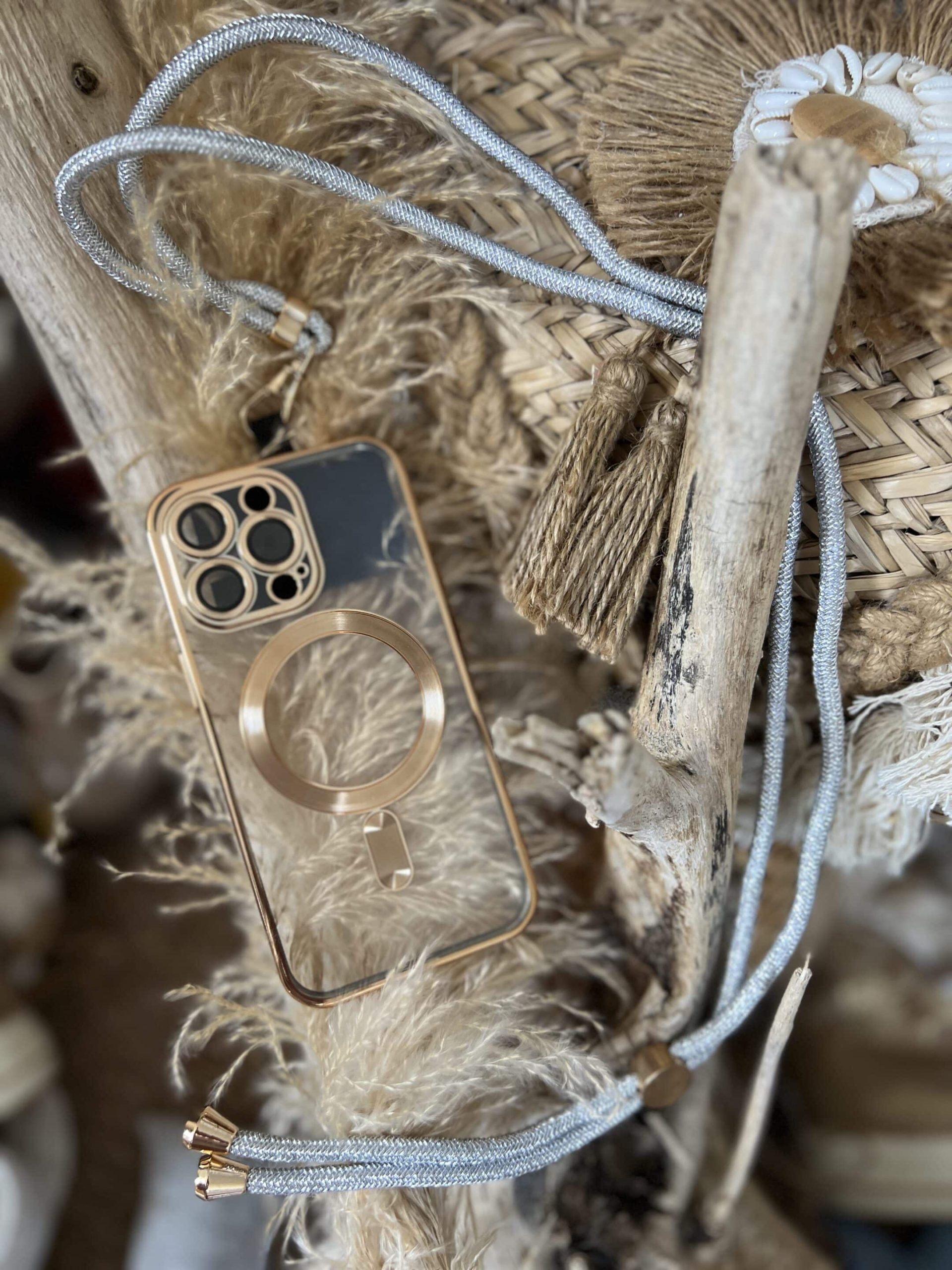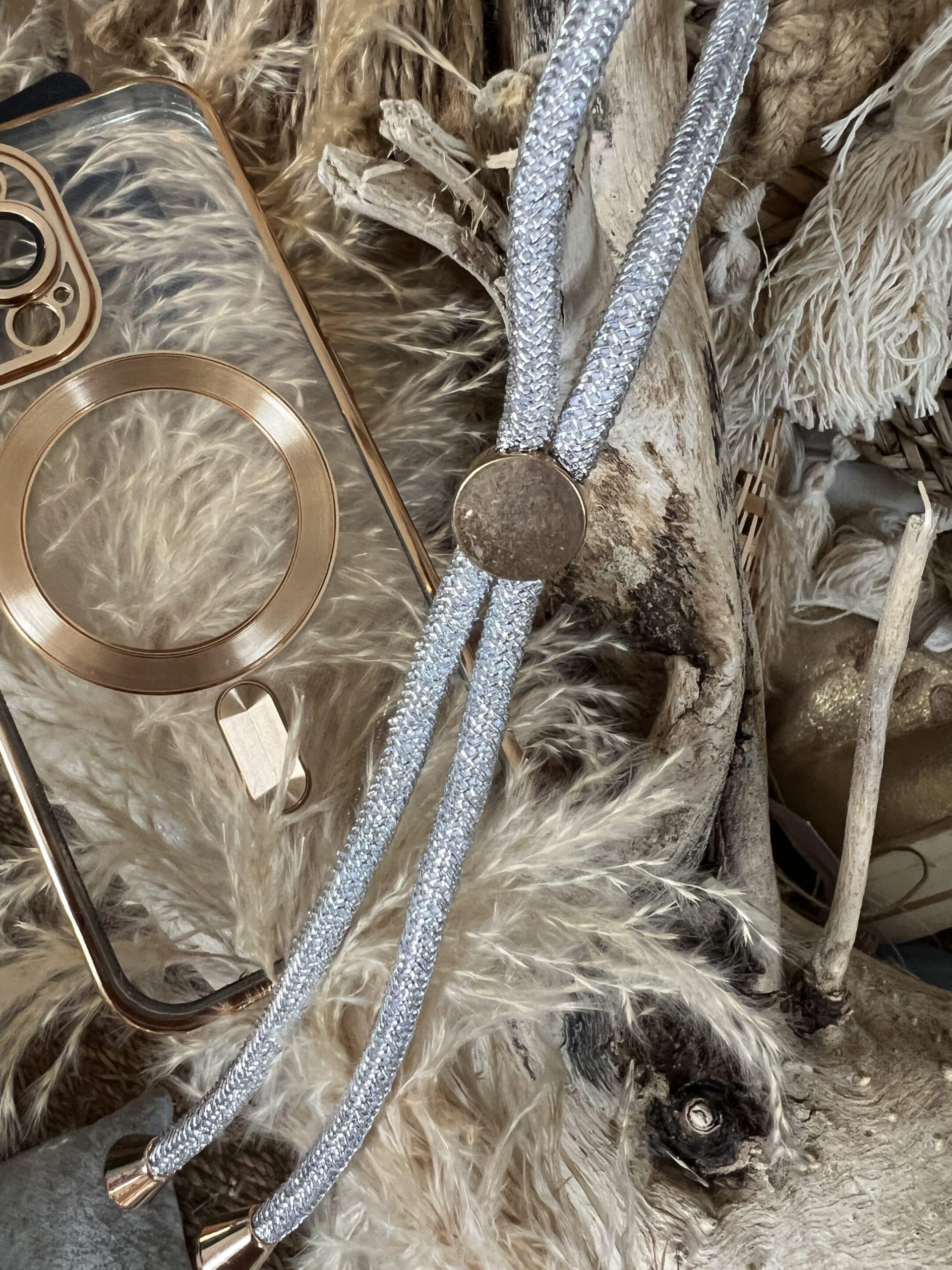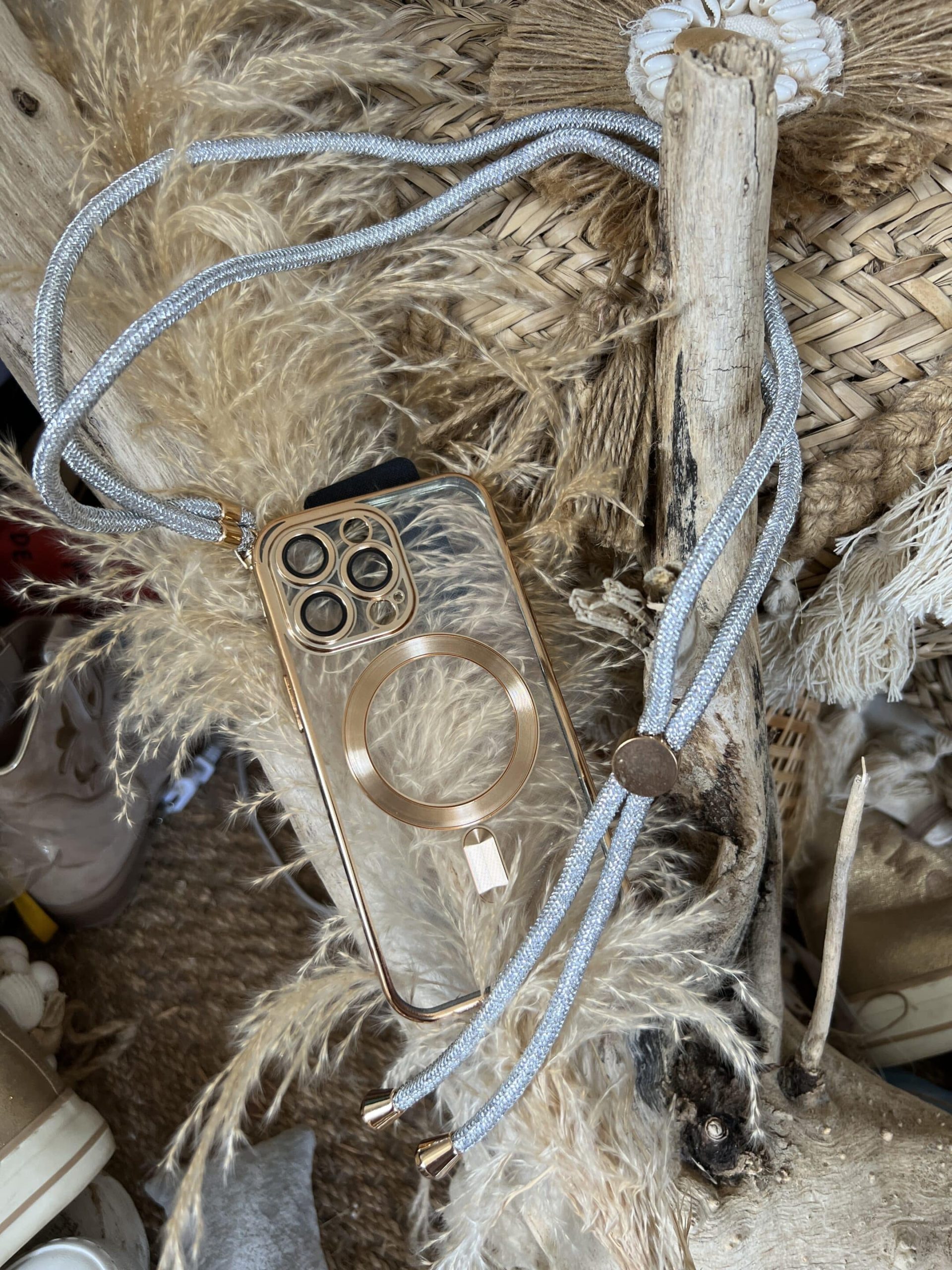Bandoulière avec adapteur pour nos téléphones très pratique quand nous sommes en jupe et pas de poches 😊😊