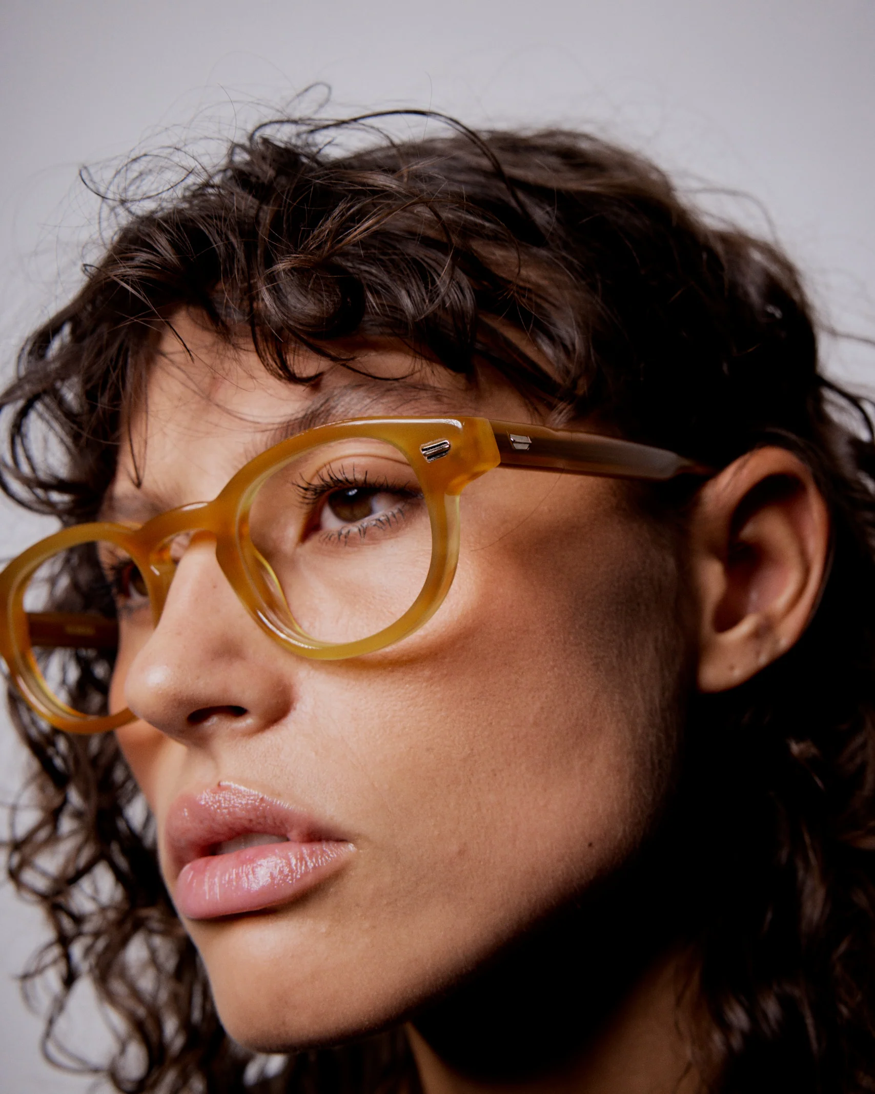 Monture de forme arrondie en acétate premium épaisse. Pont haut et rond.