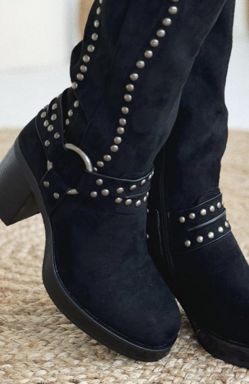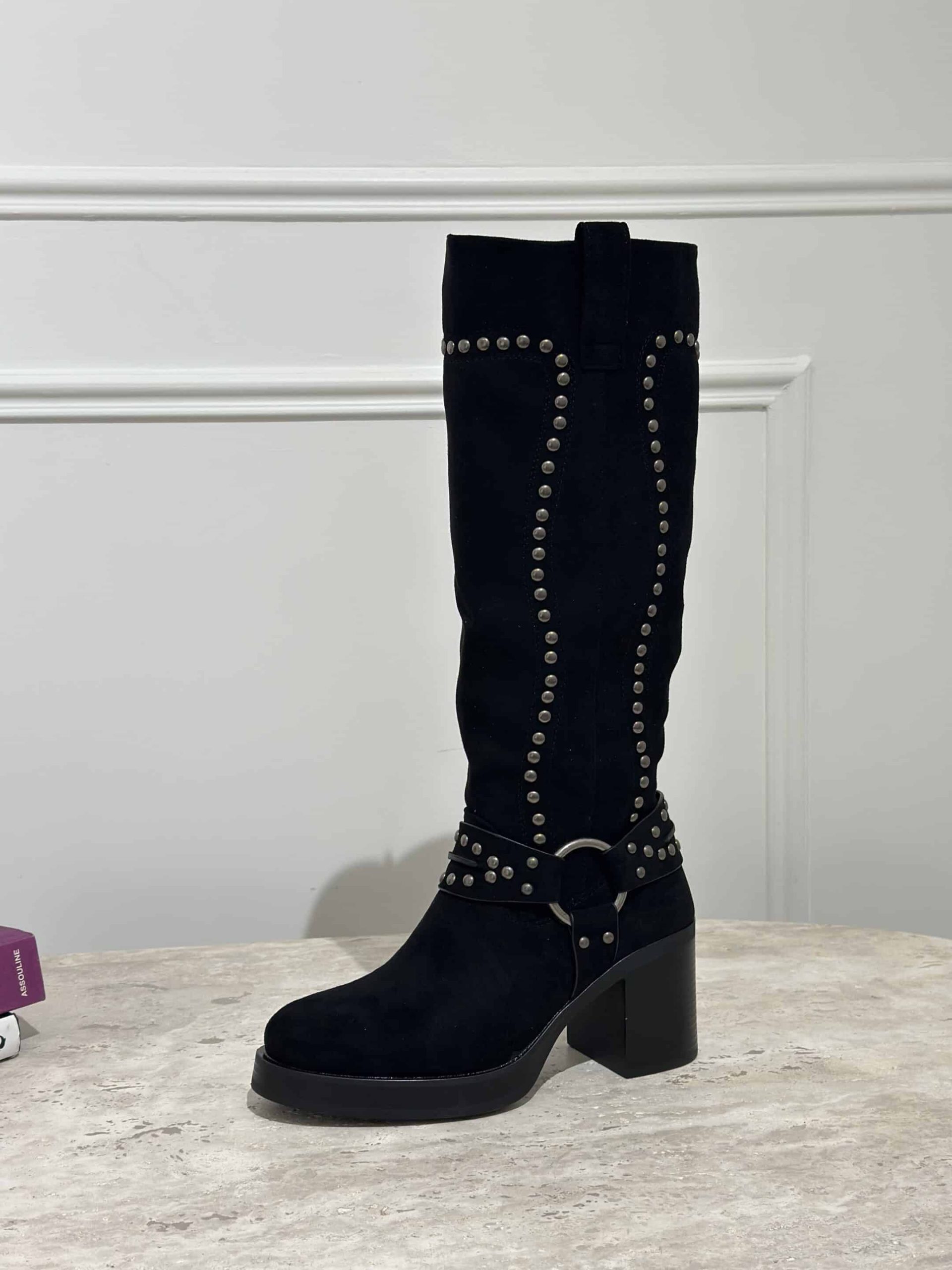 Talon carré, tres confortable!! Clous argents Grande fermeture eclair. Matière: suédine. Mesures pour un 37: Hauteur tige: 37cm & Hauteur talon: 8cm & Circonférence: 38cm. Prendre sa pointure habituelle.