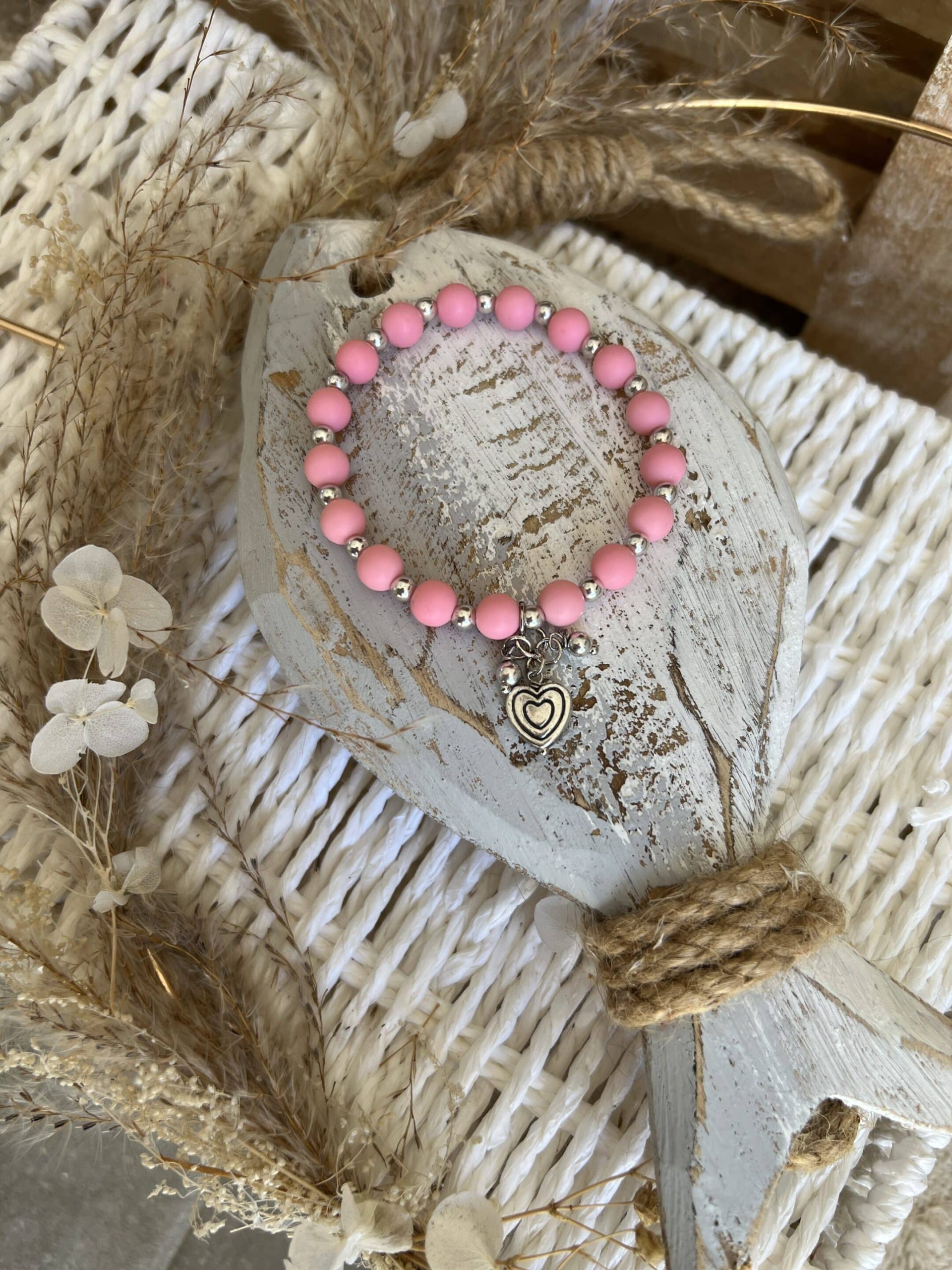 Bracelet élastique perles résine rose perles métal argente sans nickel