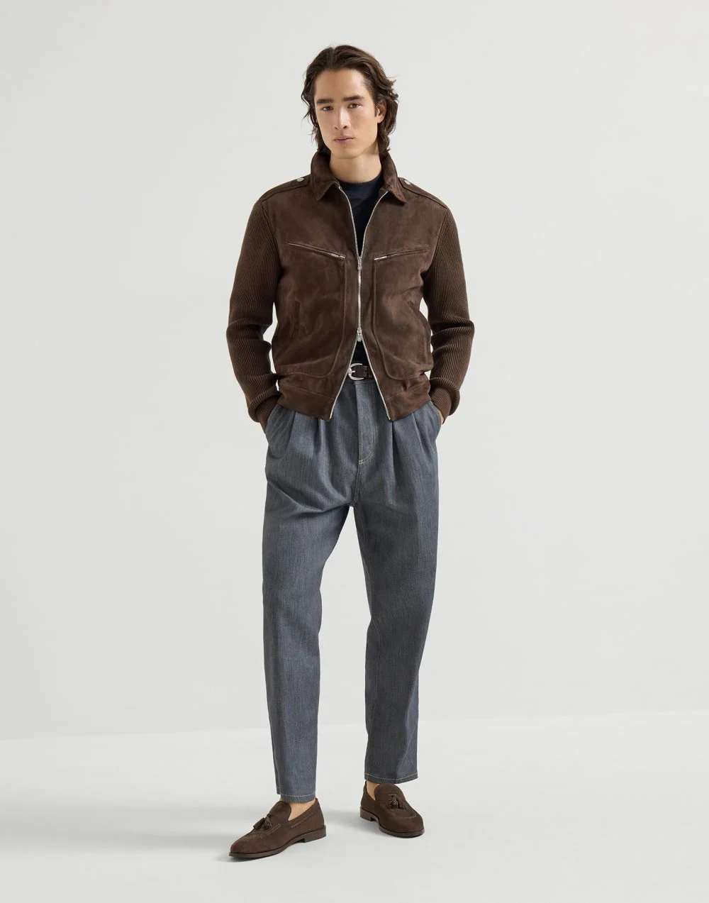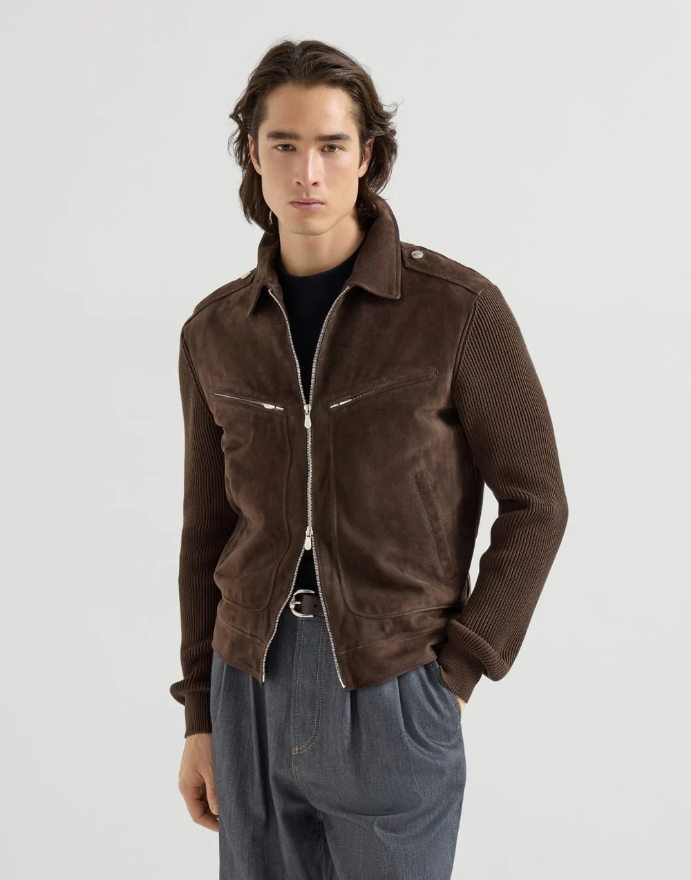 BRUNELLO CUCINELLI – Blouson en daim et maille de coton Expresso