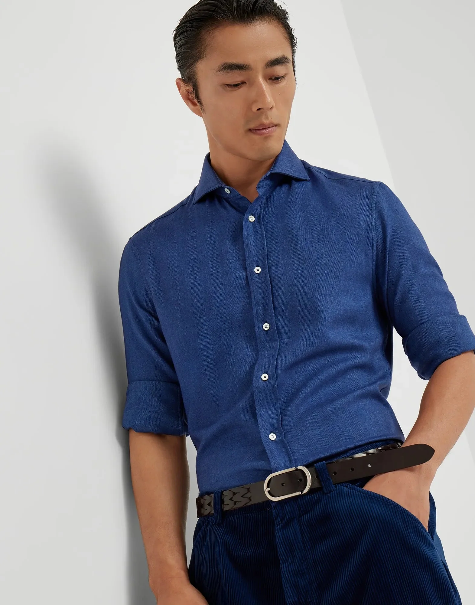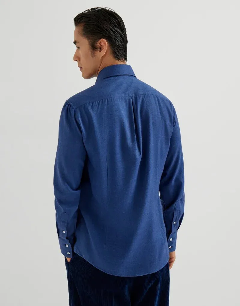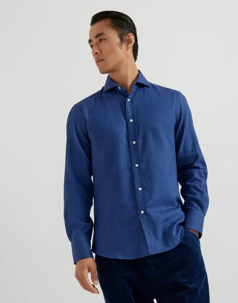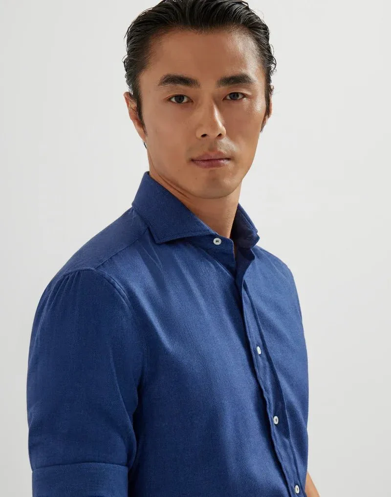 BRUNELLO CUCINELLI – Chemise coupe slim en flanelle de coton extensible motif chevrons à col français bleu