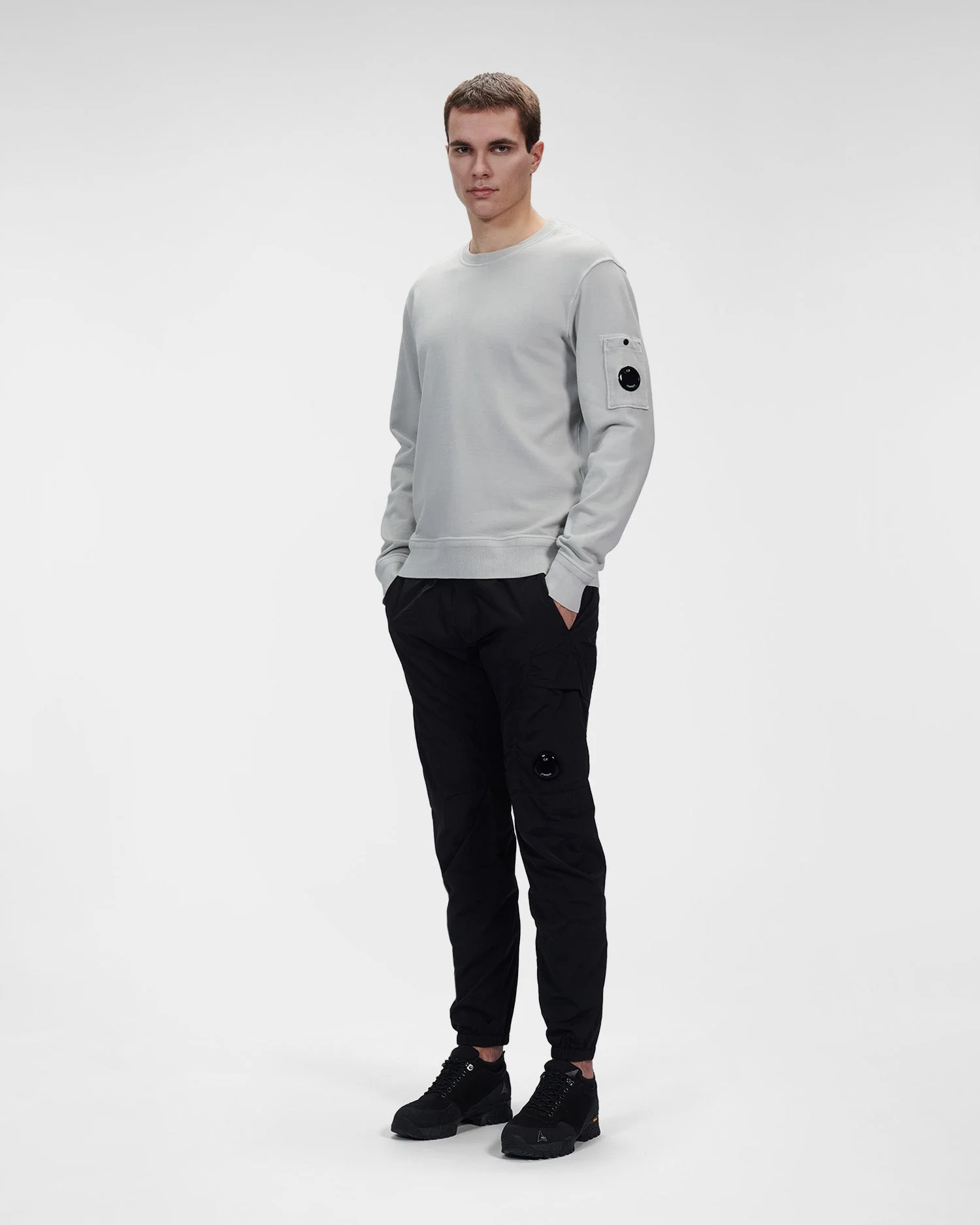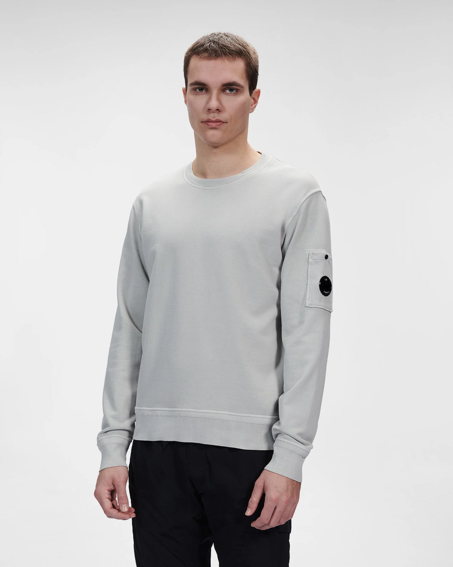 Sweat-shirt à col ras du cou, rehaussé du détail en forme de verre de lunette C.P. Company sur la poche de la manche et de bords côtelés. Modèle confectionné dans un molleton de coton mi-épais, puis teint par réserve pour un fini ton sur ton contrasté.