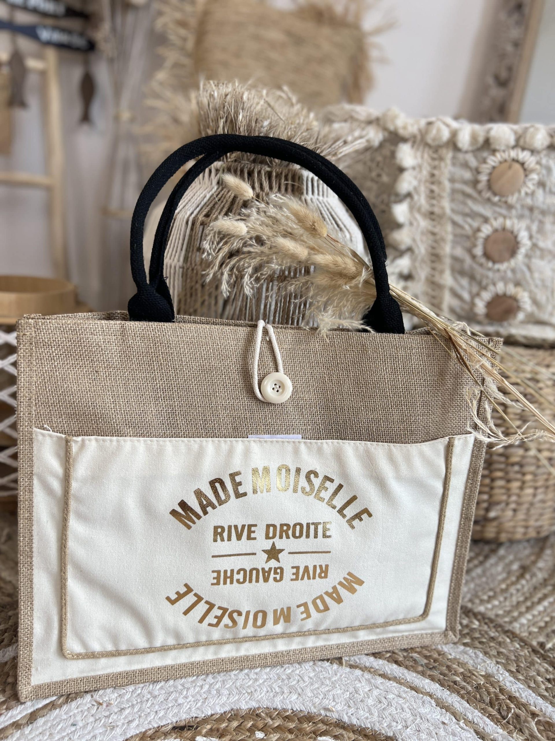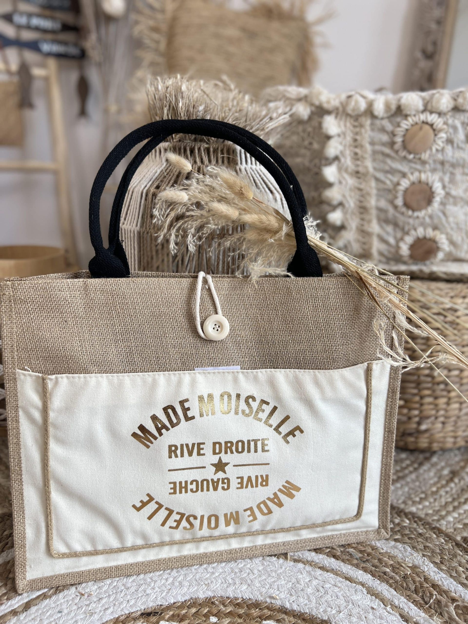 Cabas jute fermeture bouton 38×29