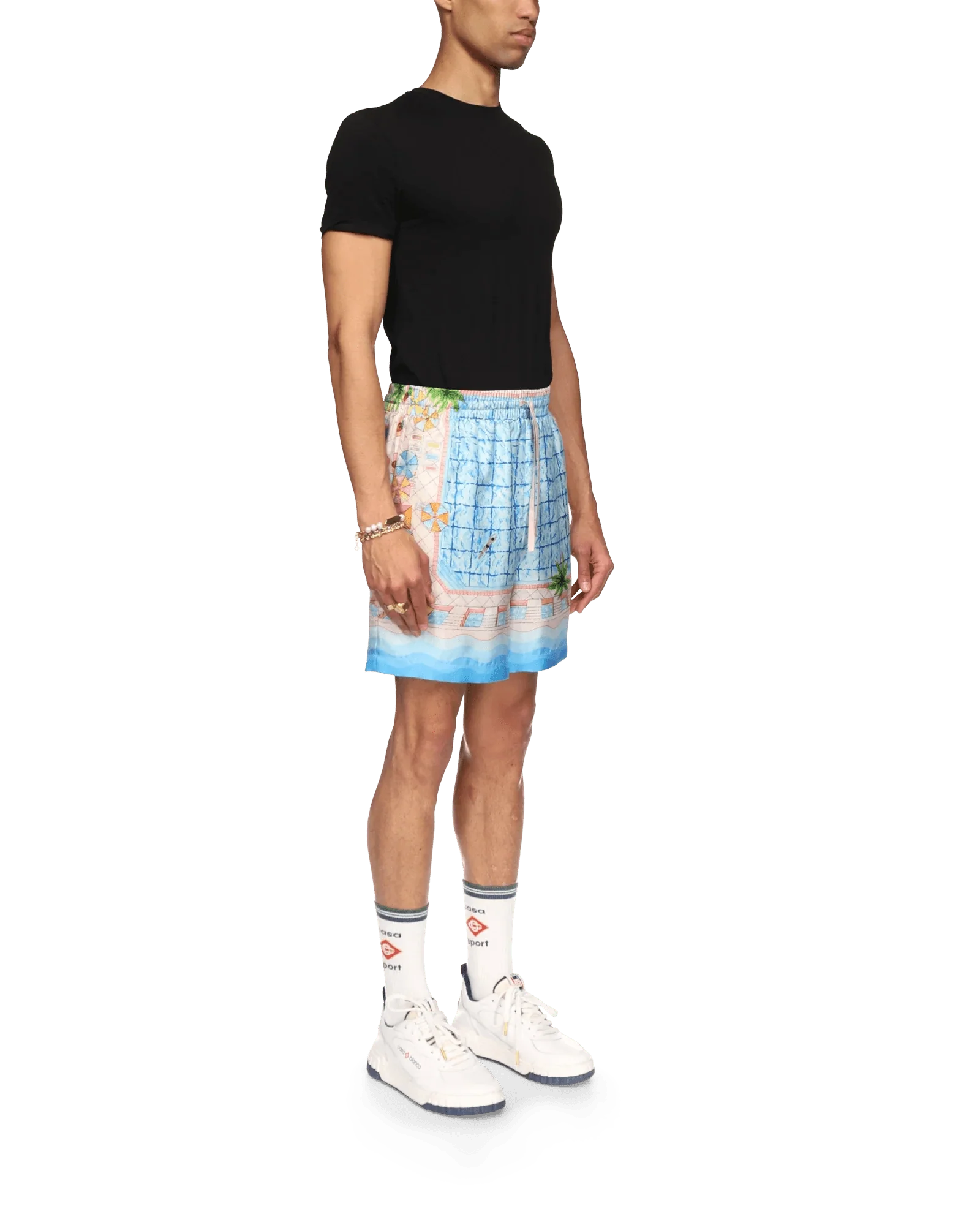 Le short en soie Le Plongeon est un modèle familier confectionné en sergé de soie imprimé et arbore des illustrations saisonnières inspirées d’une belle journée à la piscine de l’hôtel et de l’idéalisme du voyage vu d’en haut – offrant une nouvelle perspective. La palette de couleurs est claire et idéaliste, composée de tons pastel doux. Il est complété par une ceinture élastiquée avec cordon de serrage, des poches latérales, une poche arrière et des détails de rayures dégradées contrastées inspirées des vagues de Memphis sur l’ourlet.