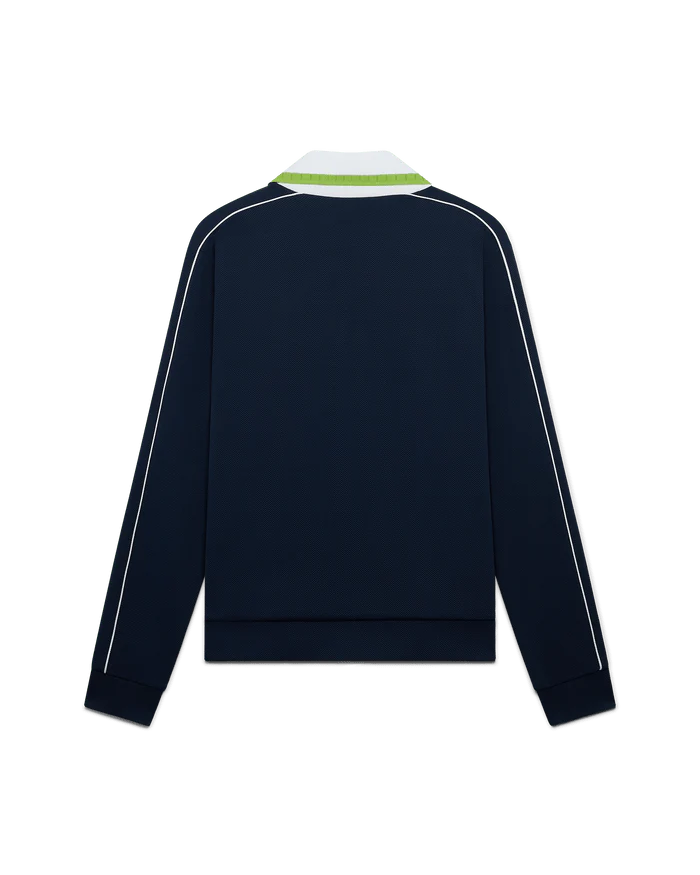 Incarnez l’élégance sportive avec cette veste de survêtement Casablanca en piqué bleu marine. Cet incontournable du vestiaire combine style et confort avec son tissu noble composé de polyamide, viscose et élasthanne. Détails signature : fermeture éclair ornée du losange emblématique, col côtelé, bande contrastante vert et blanc sur la poitrine, et liserés raffinés aux épaules et manches. La doublure intérieure et les finitions côtelées aux poignets assurent une finition impeccable. Coupe ajustée, fabriqué au Portugal. Entretien délicat recommandé.