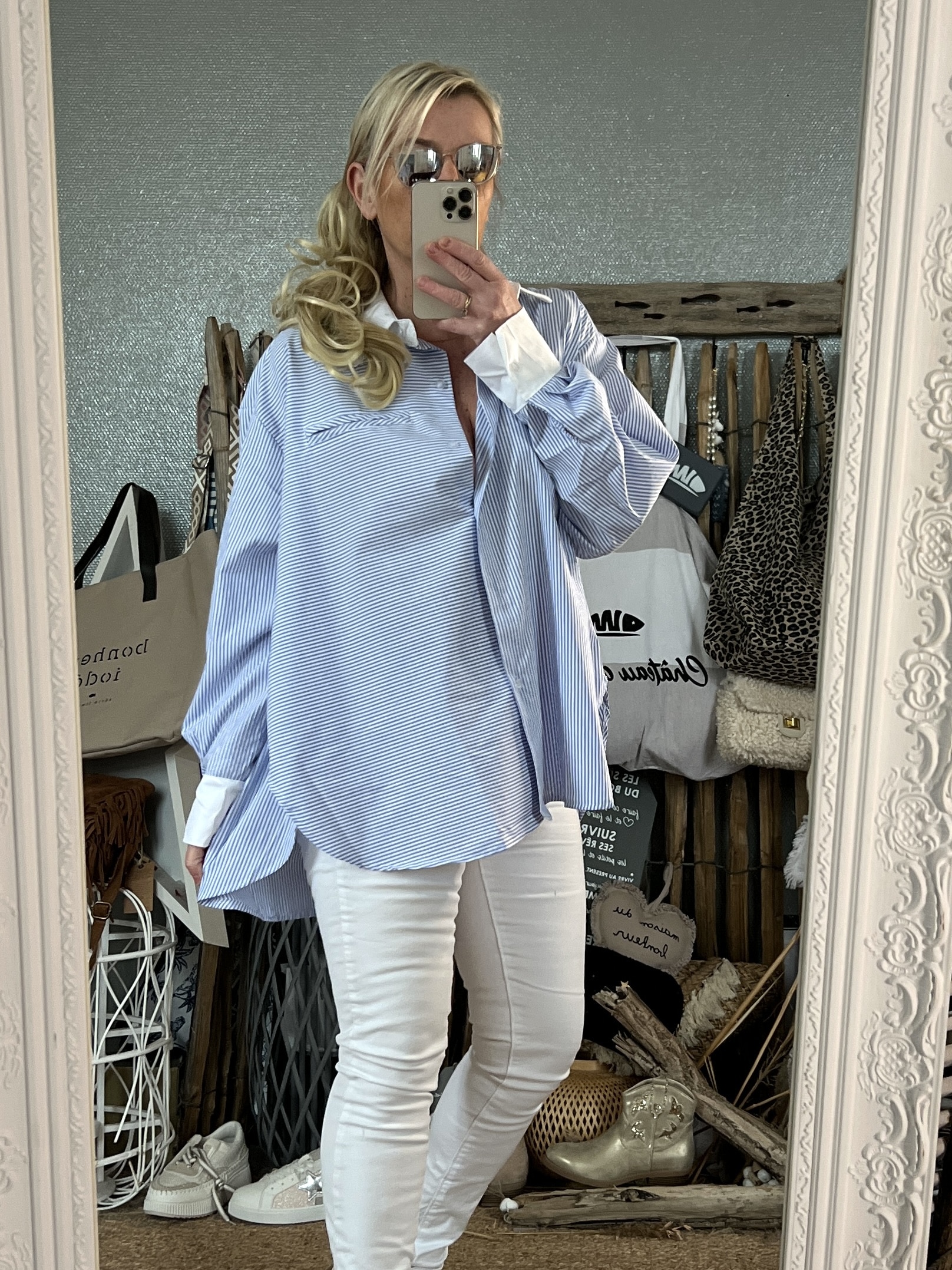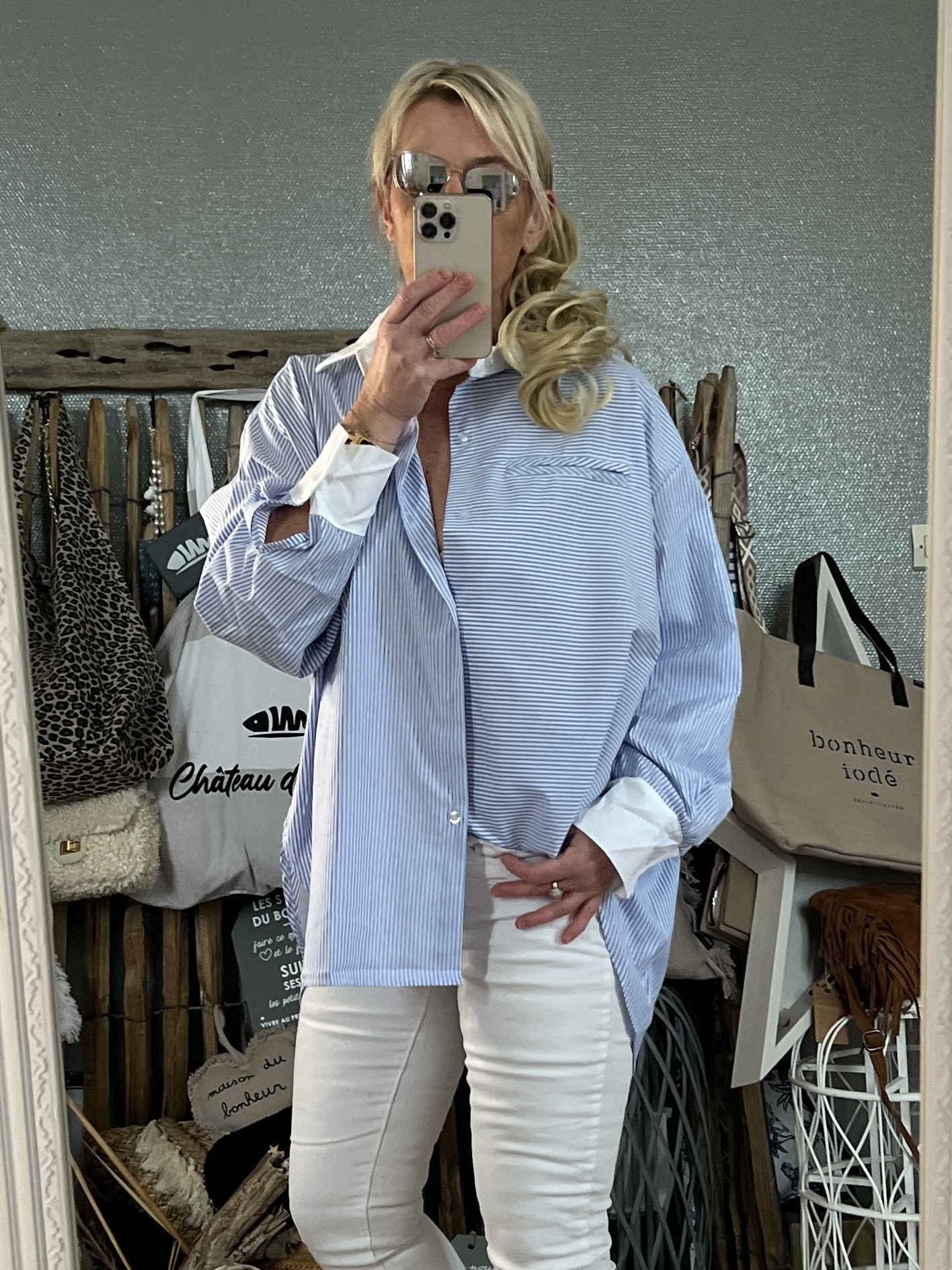 Je suis fan de notre élégante chemise rayée bleu et blanc ! Avec ses 3 boutons dorés sur l’épaule et sa cravate assortie qui permet de faire un joli noeud sur le côté, elle offre une touche chic et raffinée. Parfaite pour un look stylé! On l’aime particulièrement portée avec un jean
