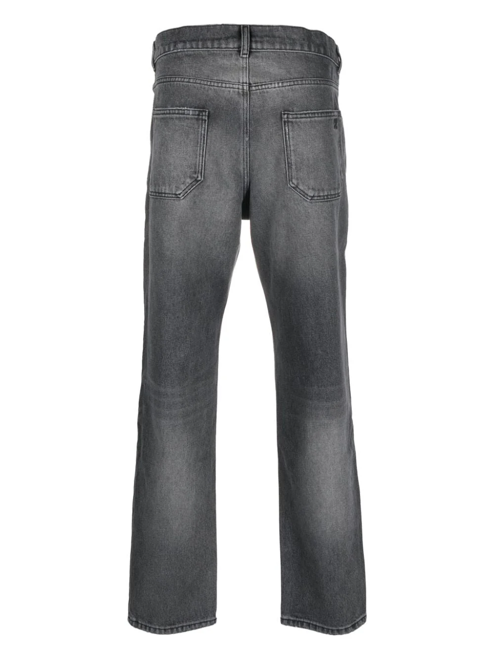 Gris cendré, coton, effet délavé, finitions à effet usé, logo brodé à l’arrière, détails de rivets, taille mi-haute, passants de ceinture, coupe droite, fermeture à braguette dissimulée et bouton, cinq poches classiques.