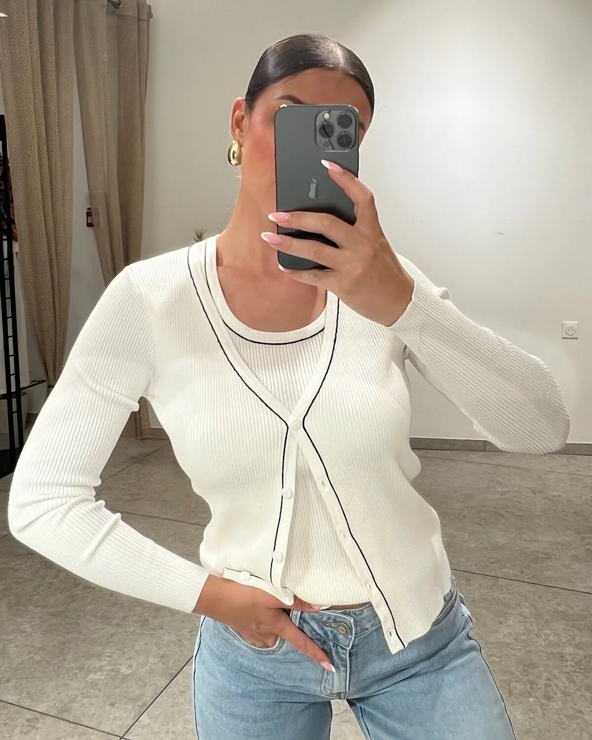 Ensemble deux pièces débardeur gilet pour femme, en viscose et polyamide, idéal pour l’automne/hiver.