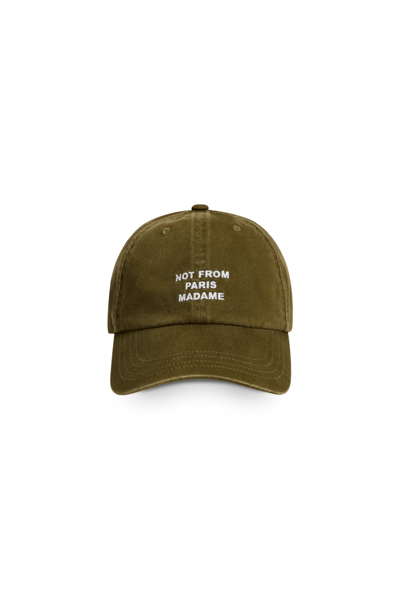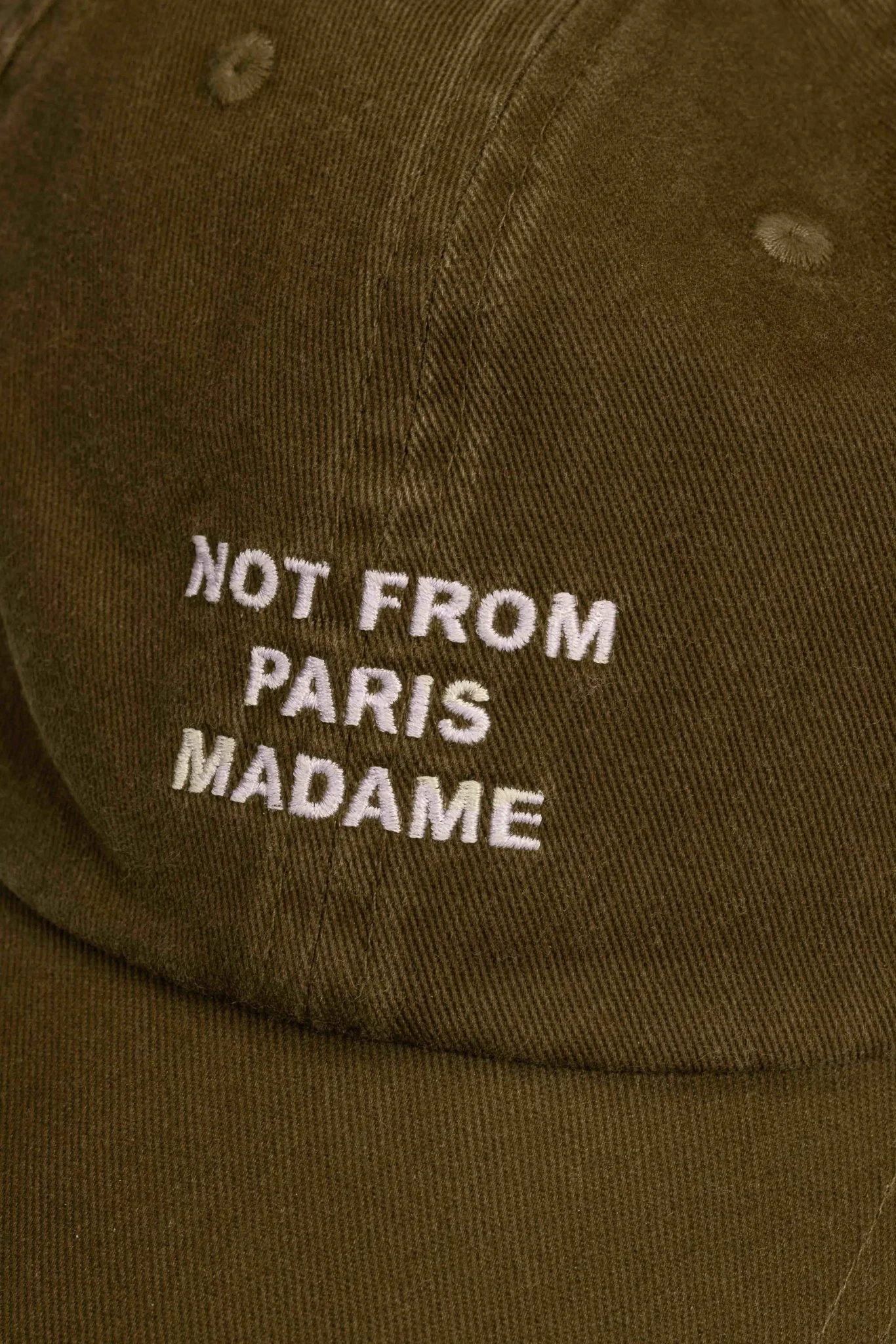 Cette casquette bleu ciel 6 pans 100% coton est dotée d’une patte de réglage avec boucle métal et du slogan « Not From Paris Madame » brodé à l’avant.