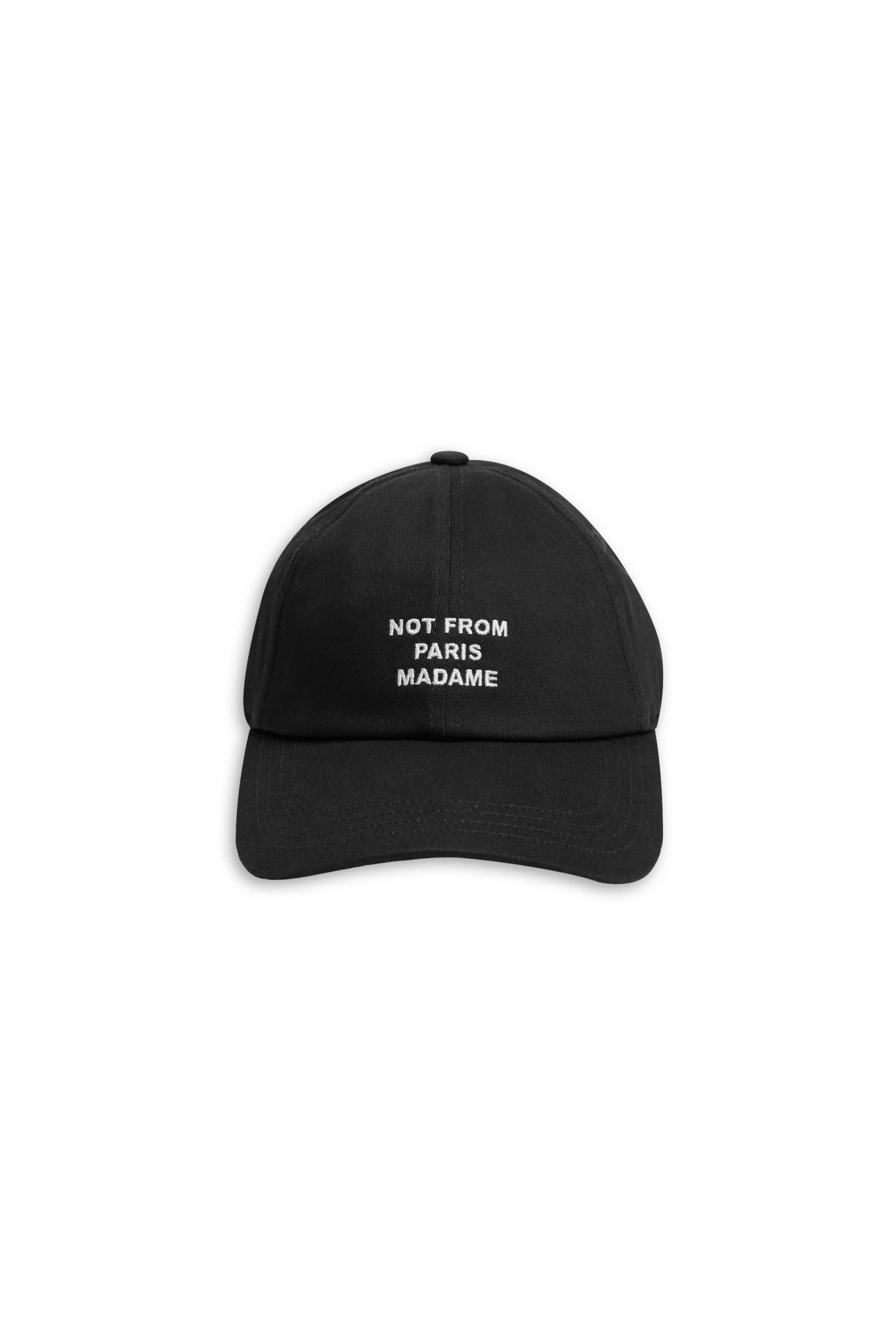 Cette casquette de baseball noire à 6 pans, 100 % coton, avec fermeture à bouton-pression en métal, est brodée du slogan « Not From Paris Madame » sur le devant.