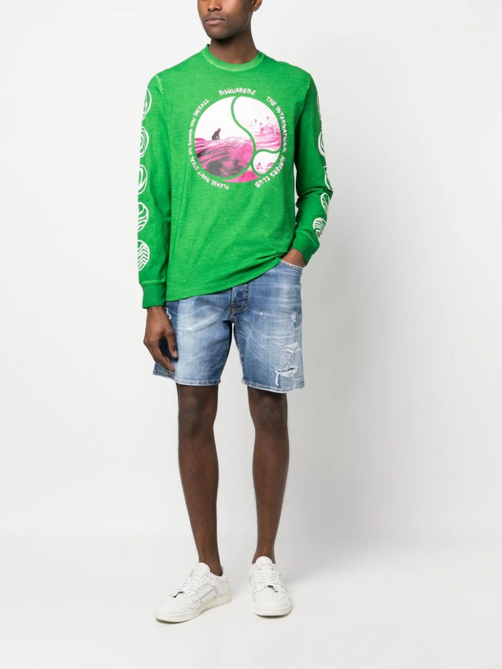 Bleu, coton stretch, effet usé, patch logo sur l’arrière, passants de ceinture, fermeture à braguette dissimulée et bouton, cinq poches classiques, longueur au dessus du genou. Fabrication : Italie Extérieur : Coton 99%, Élasthanne 1% Doublure : Polyester 65%, Coton 35% Lavage à la main Le mannequin mesure 1,88 m et porte une taille 46 […]