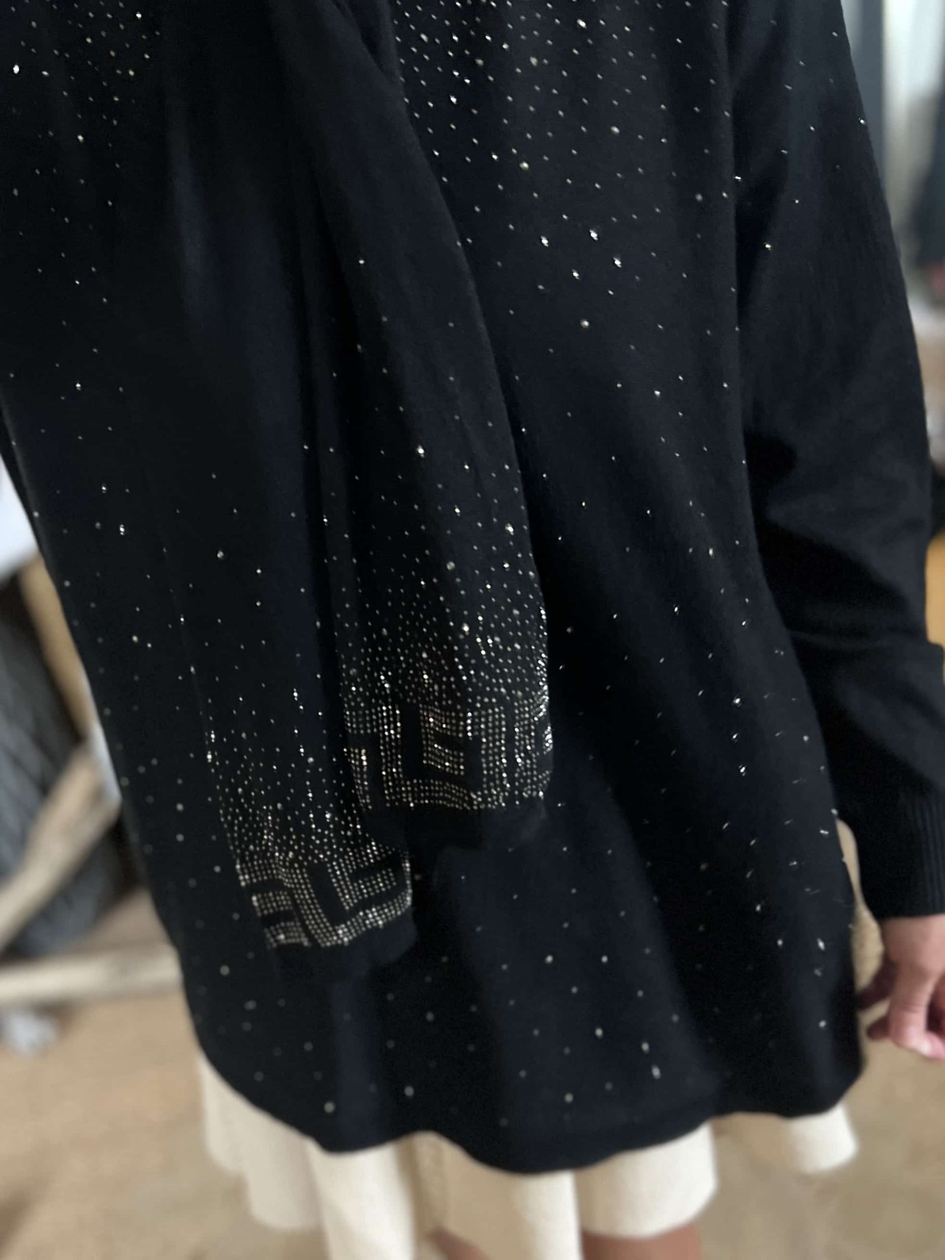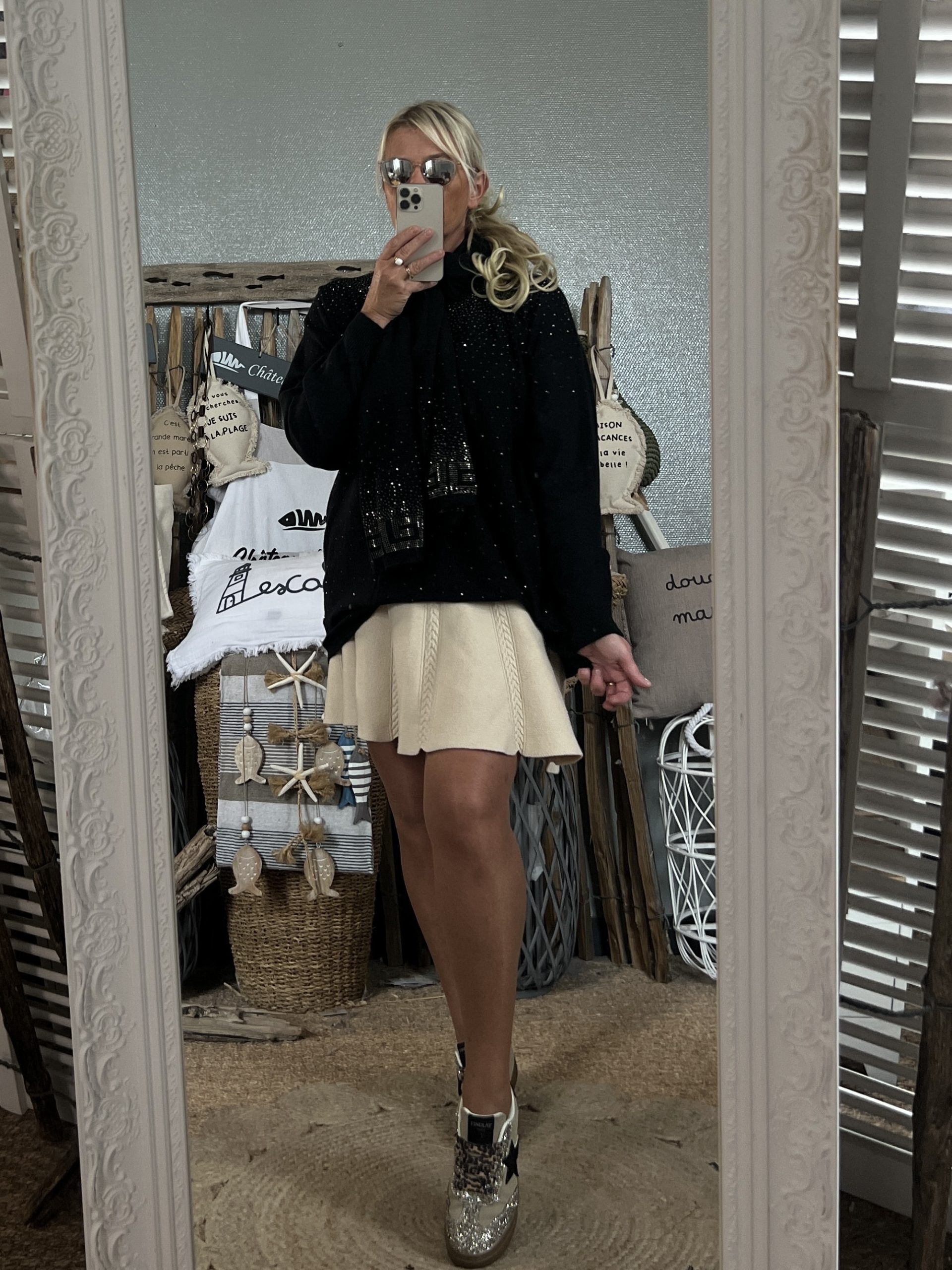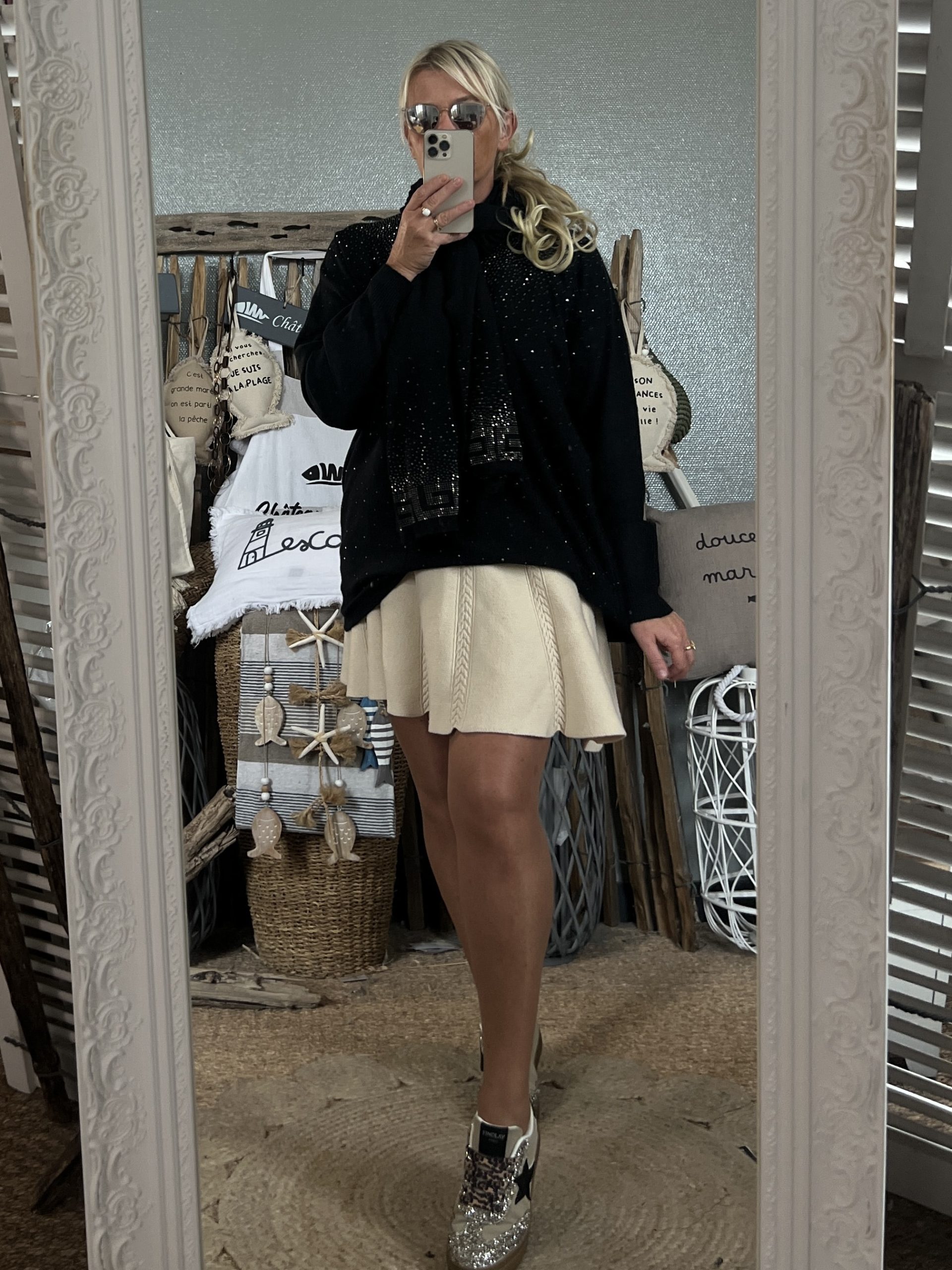 Pull et écharpe taille unique 36/46 40% Viscose 30% Polyamide 17% Nylon 13% Modal D’une douceur incroyable j’adore cette matière