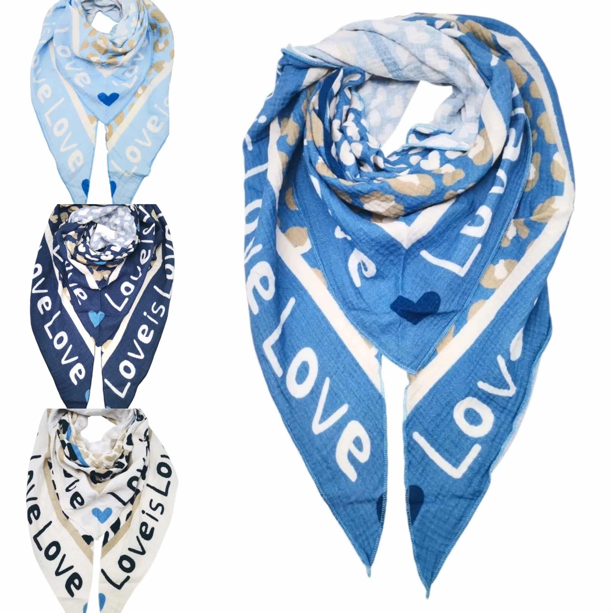 Triangle en gaze de coton motif “Love is Love”. 100% Gaze de coton. Dimension : 200cm x 80cm. Fabriqué en Italie.