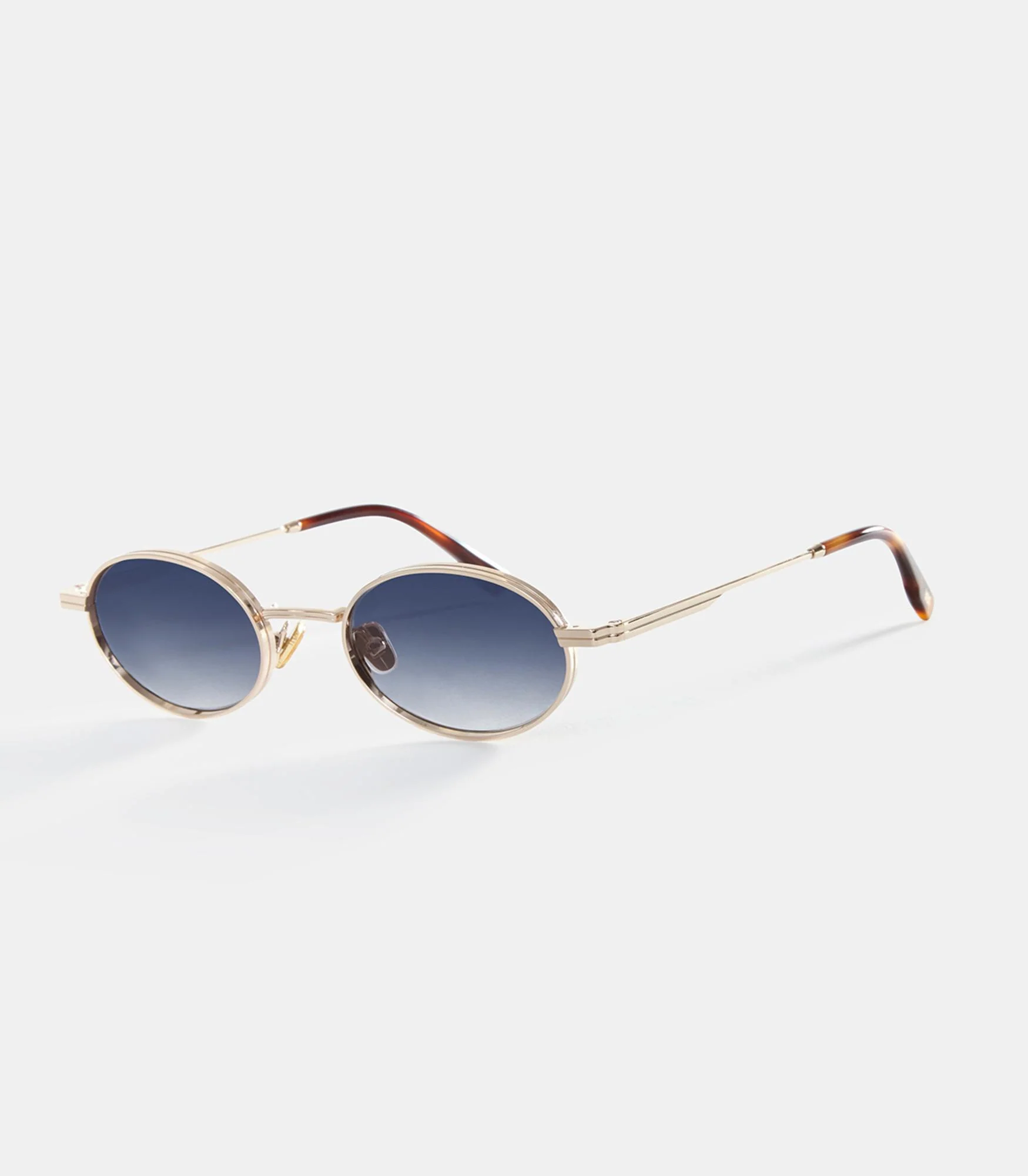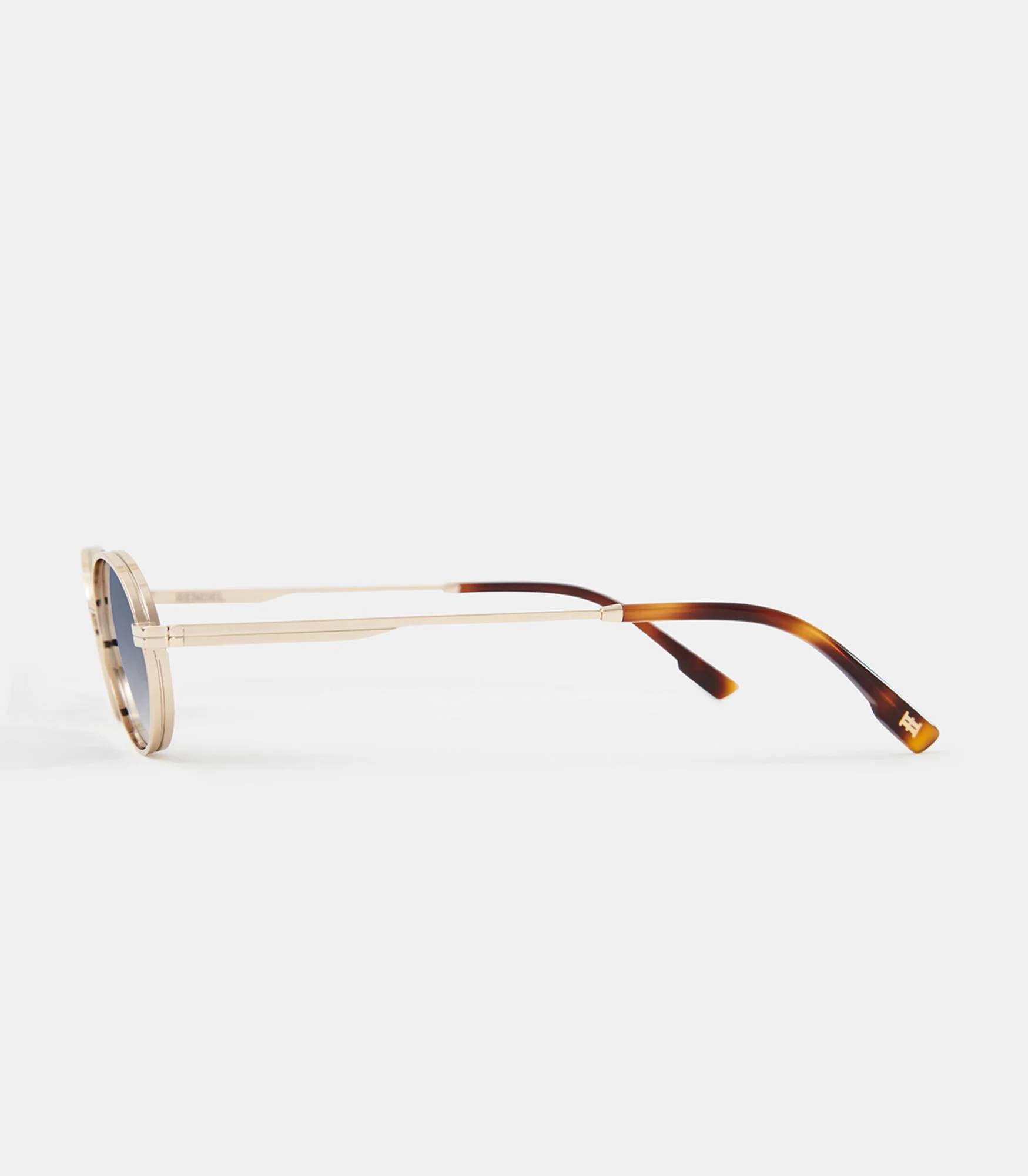 Monture métallique de forme ovale. Fines branches avec manchons en acétate, et déport sur la face avant du verre.