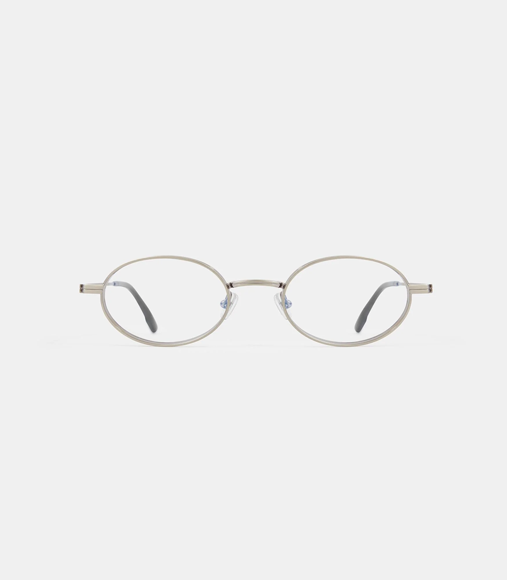 Monture métallique de forme ovale. Fines branches avec manchons en acétate, et déport sur la face avant du verre.