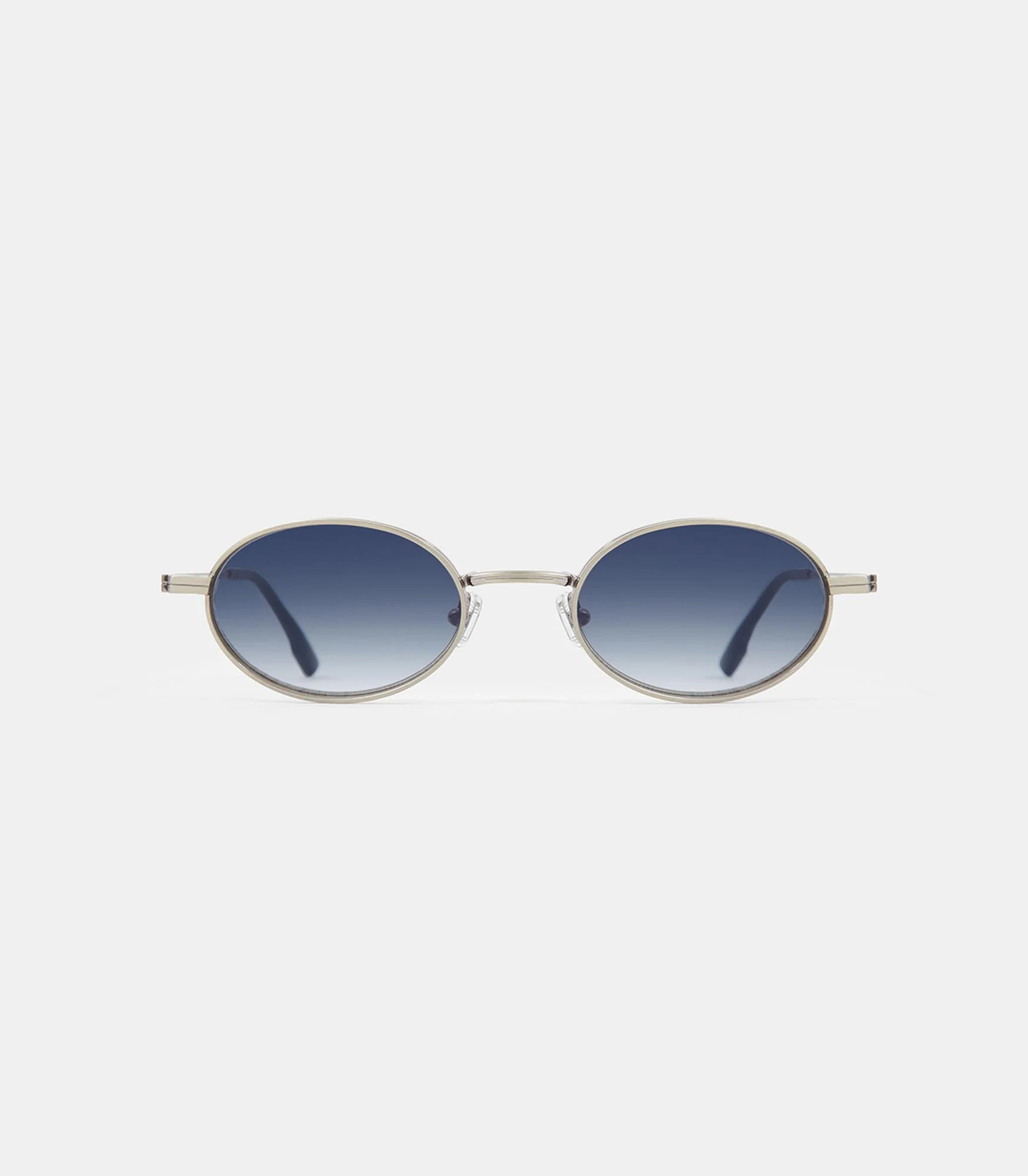 Monture métallique de forme ovale. Fines branches avec manchons en acétate, et déport sur la face avant du verre.