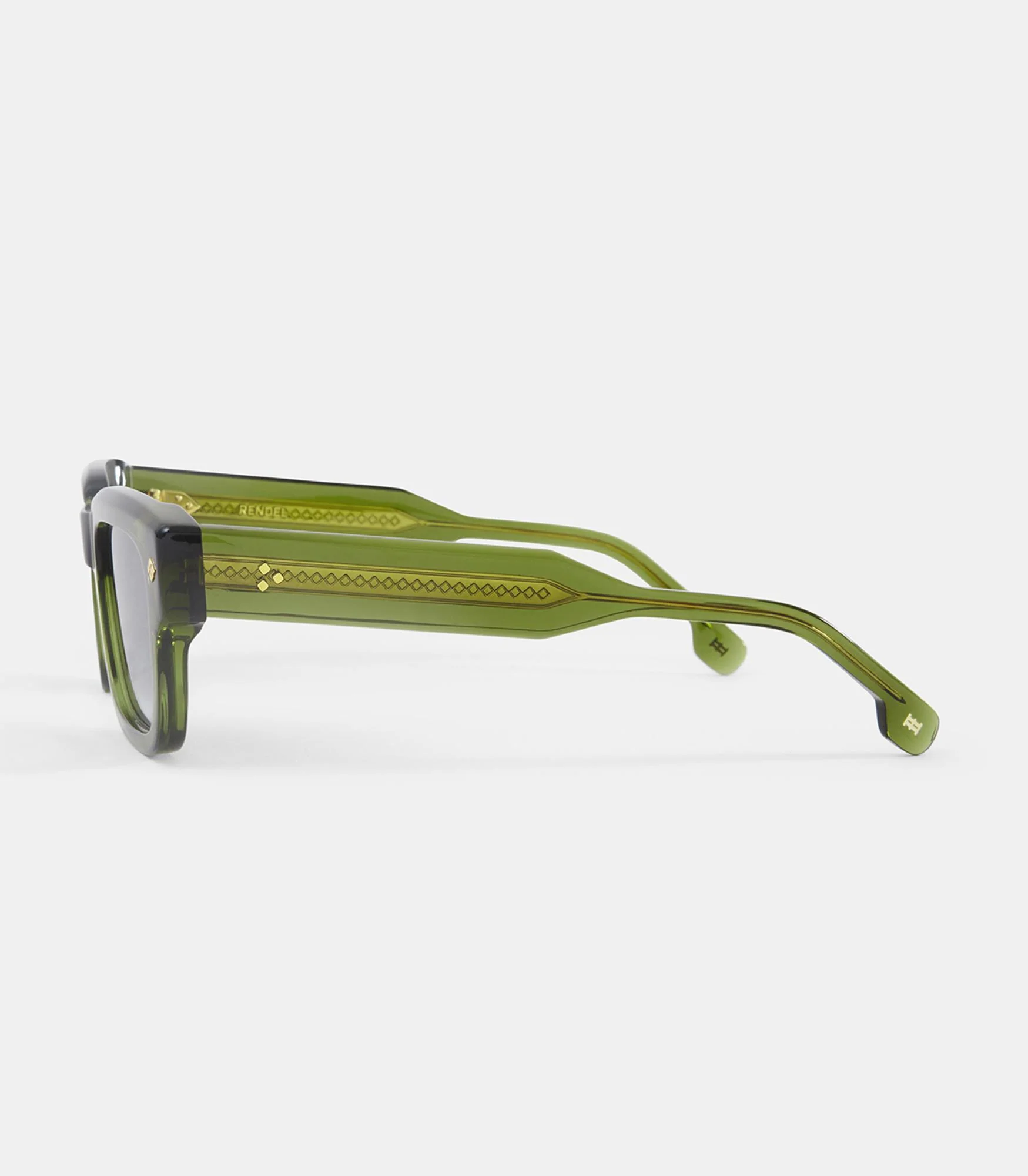 Monture en acétate Mazzucchelli de forme rectangulaire équilibrée par des contours adoucis. Rivets carrés apparents sur les bords et sur les branches, ainsi que détails de pictogrammes gravés.