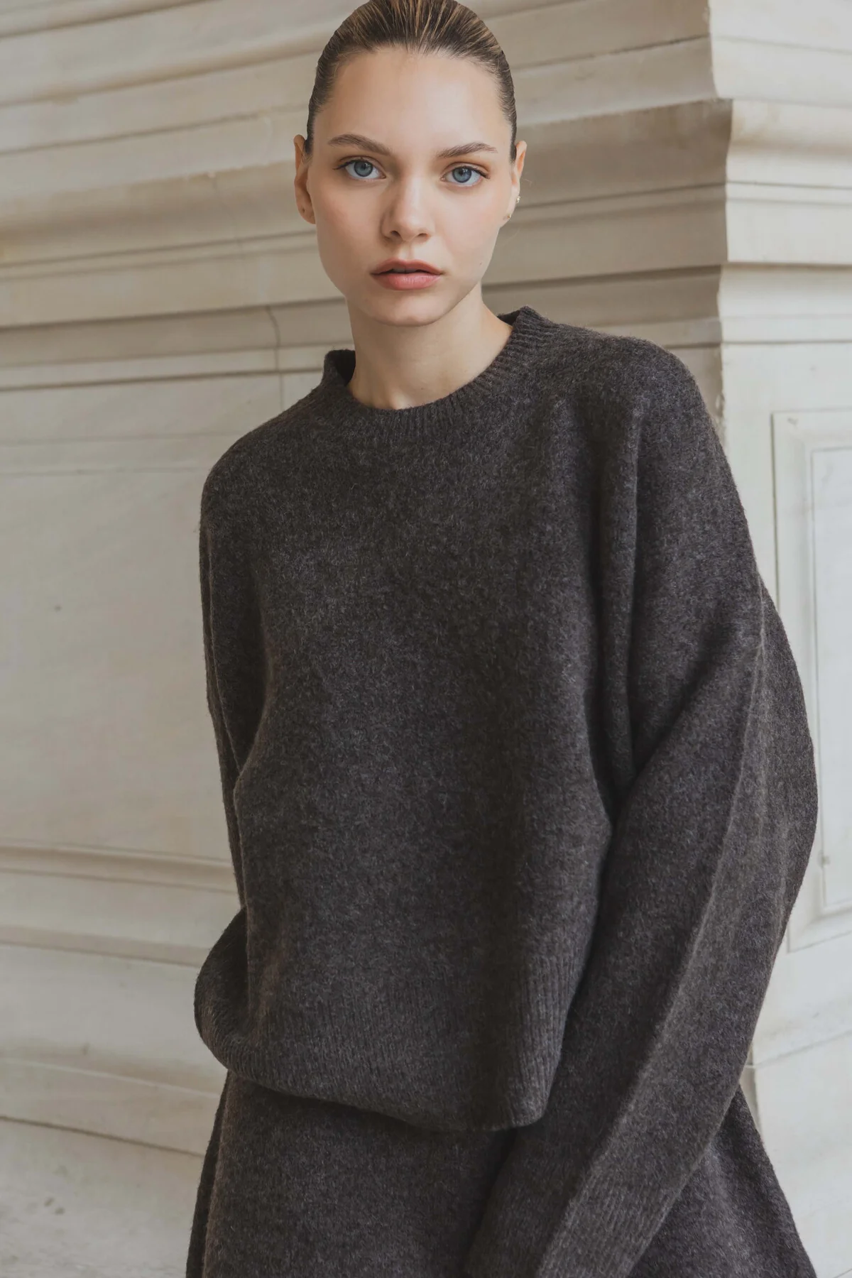 Pull basique à col rond avec manches longues. Coupe large.