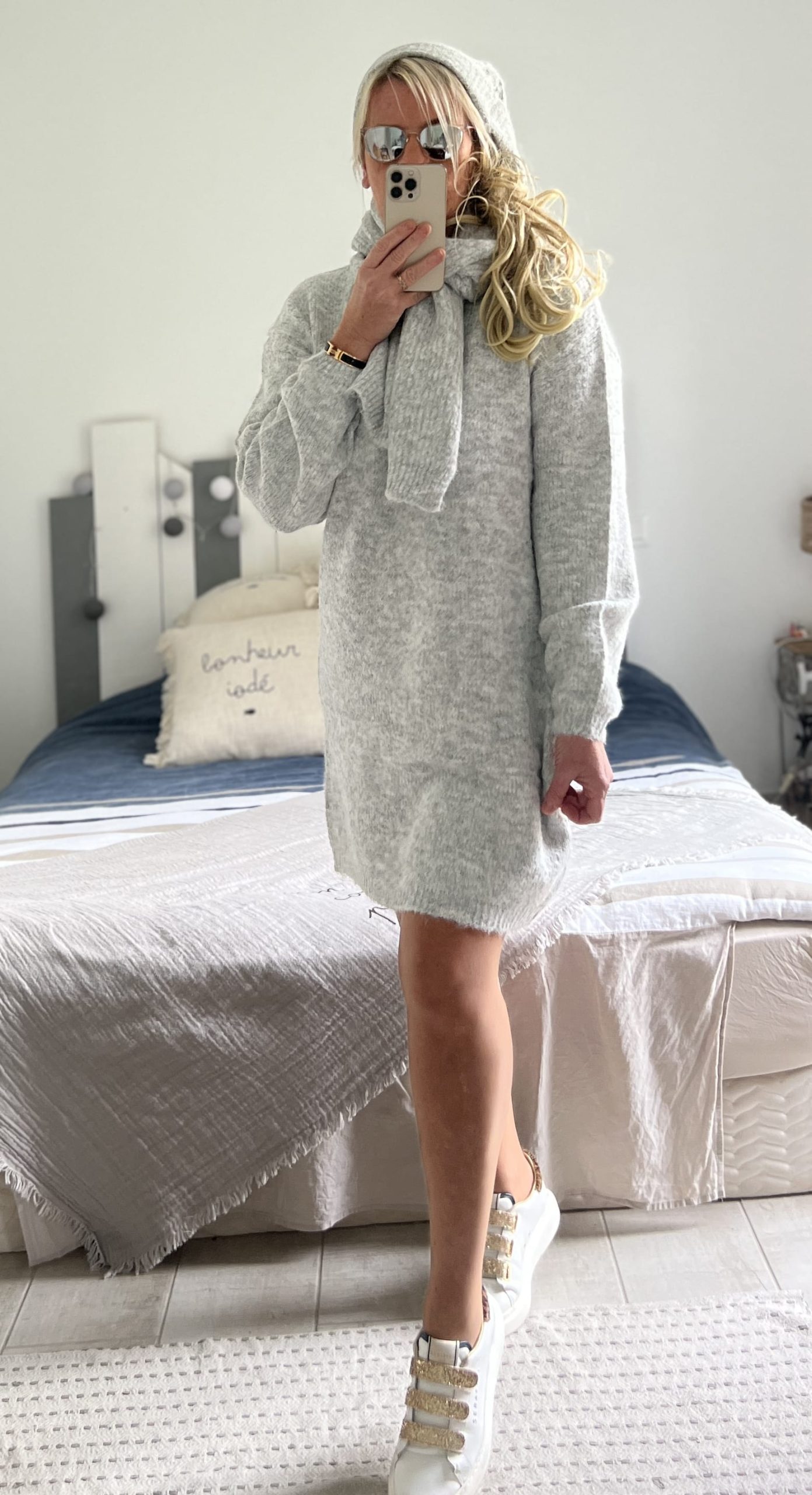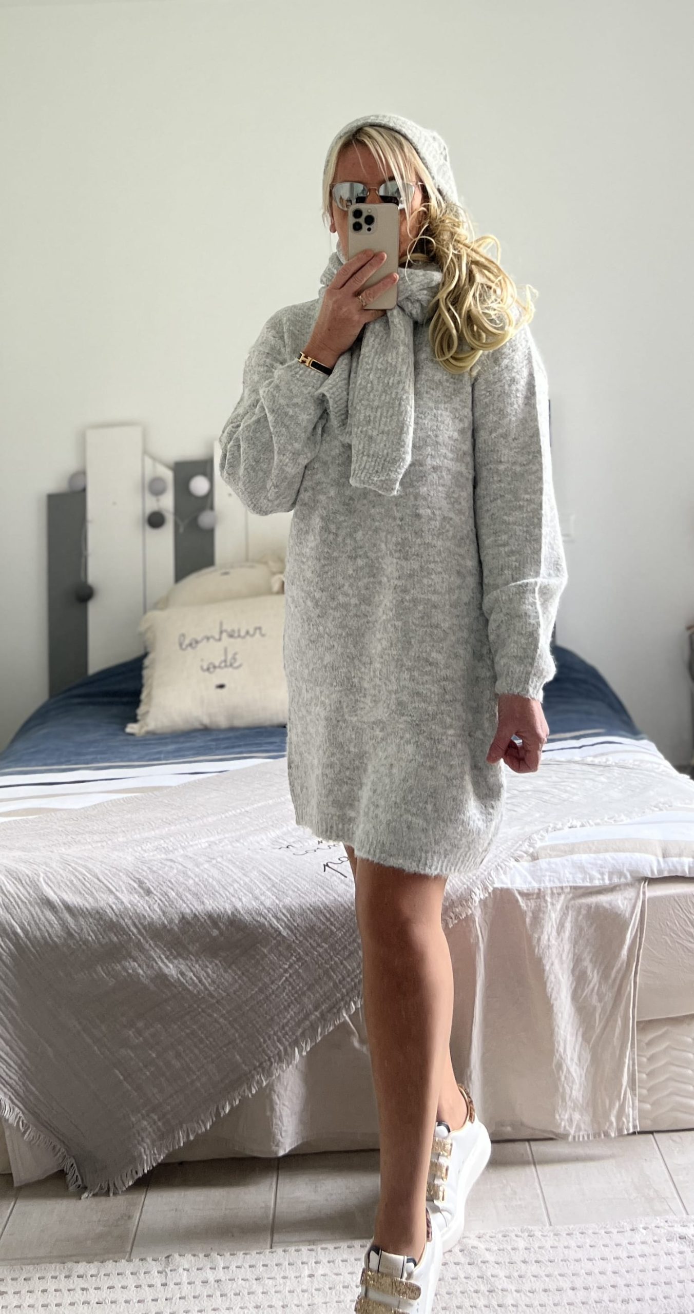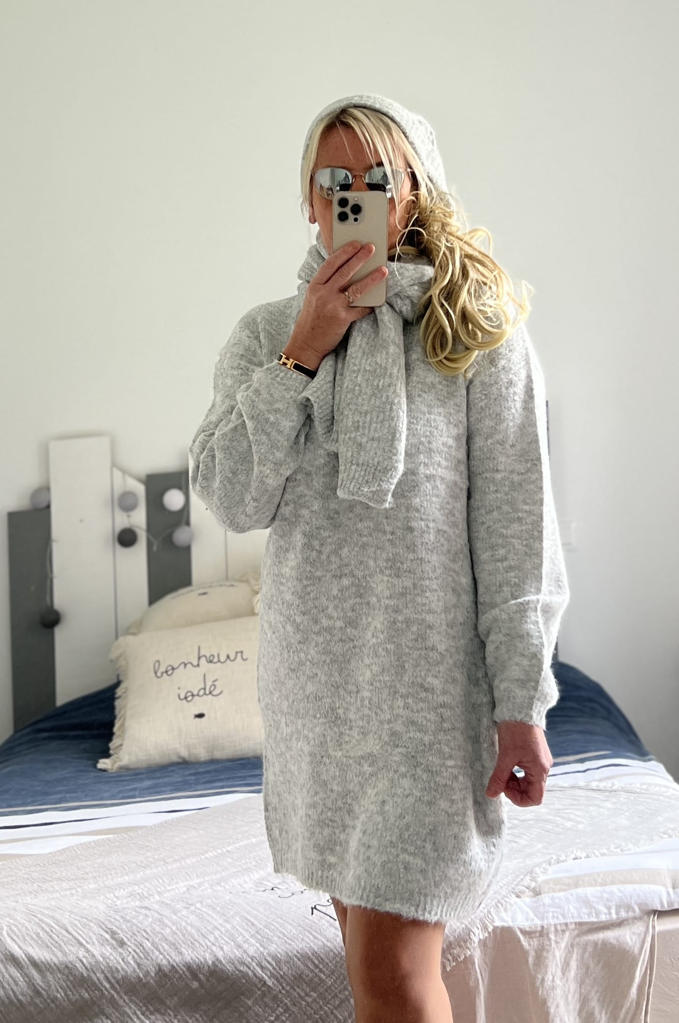 Ensemble robe bonnet écharpe gris