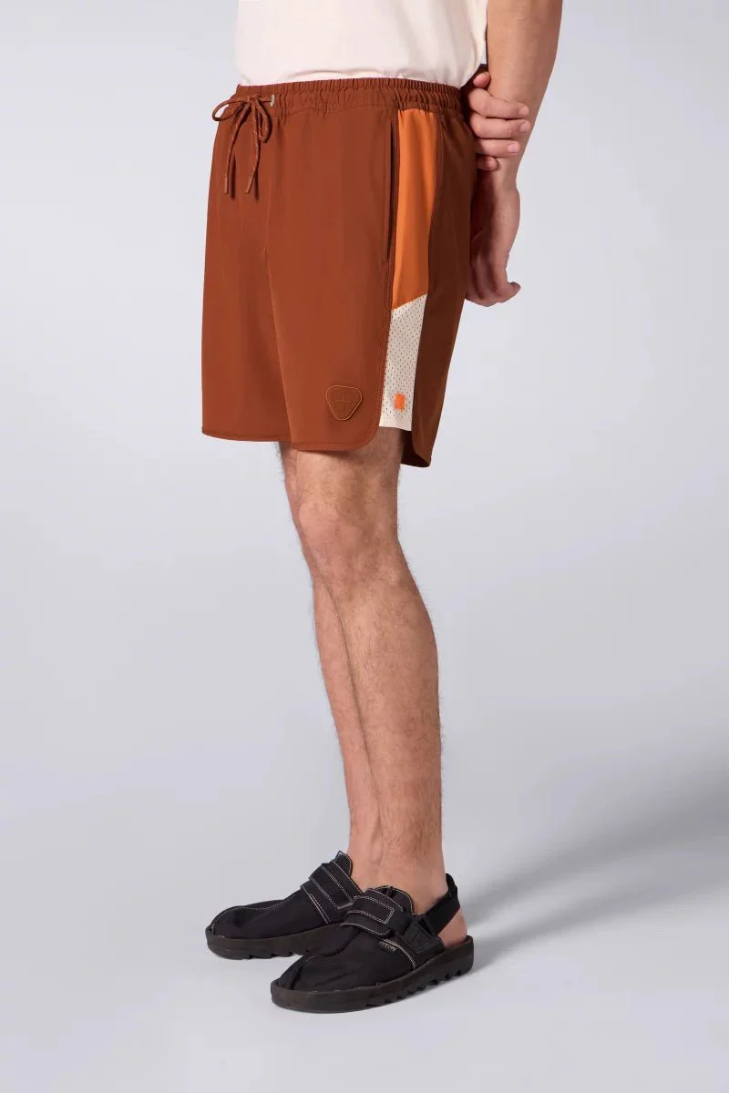 Le short de bain SAMY incarne l’alliance parfaite entre style et performance aquatique. Sa coupe courte privilégie la mobilité sans compromis, tandis que le nylon stretch haute densité garantit un séchage express et un confort durable même après des heures d’immersion. La taille élastiquée, finement ajustable via un cordon bicolore, offre un maintien anatomique précis qui s’adapte à chaque morphologie. Les bandes contrastantes latérales en marron et orange créent une structure visuelle dynamique, sublimée par un patch en silicone discret en bas de jambe qui signe la pièce avec subtilité. La doublure mesh intégrée assure une ventilation optimale et un confort de port inégalé. Composition : Polyester (90%), Élasthanne (10%) avec doublure mesh 100% polyester. Un basique revisité pour les nageurs exigeants en quête d’élégance fonctionnelle.