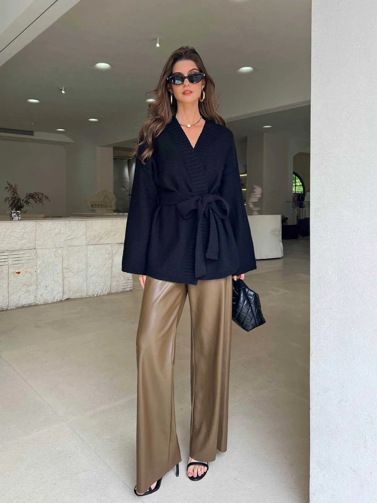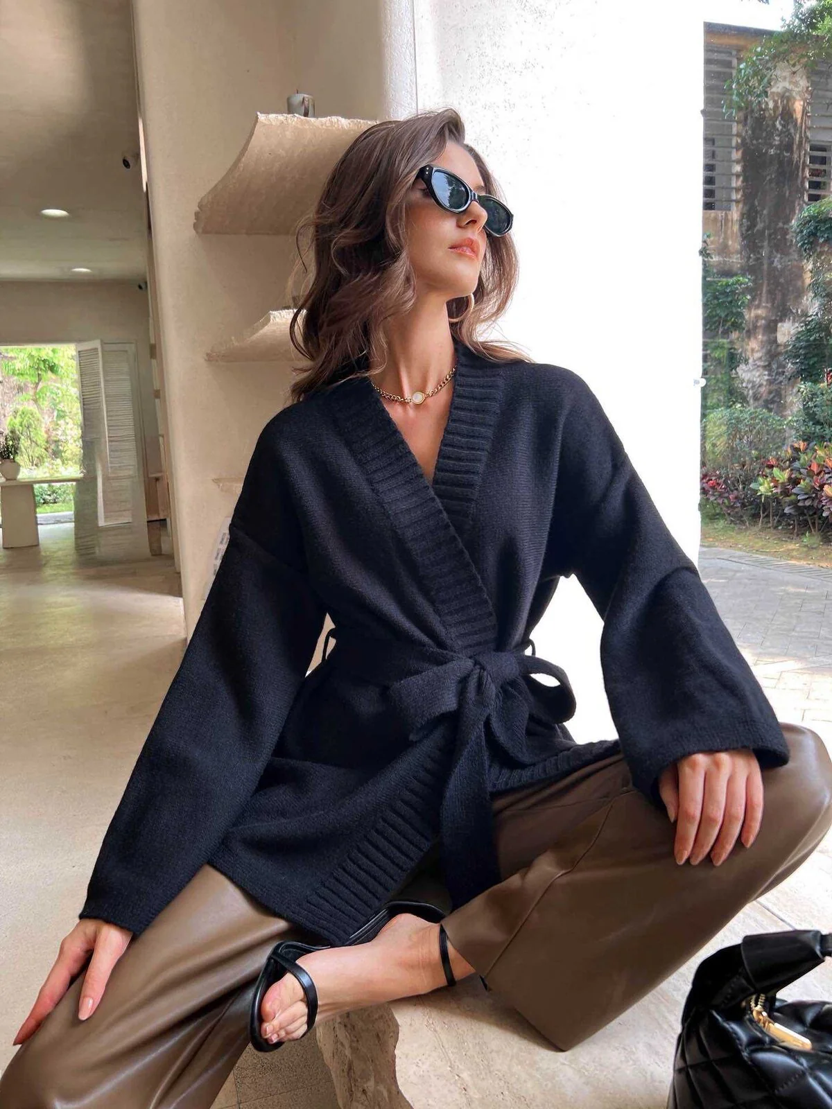 Gilet en maille avec manches évasées, col en V, ceinture à la taille.