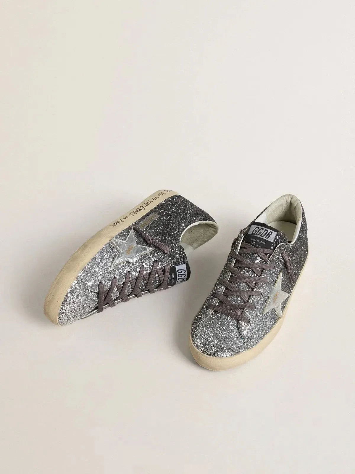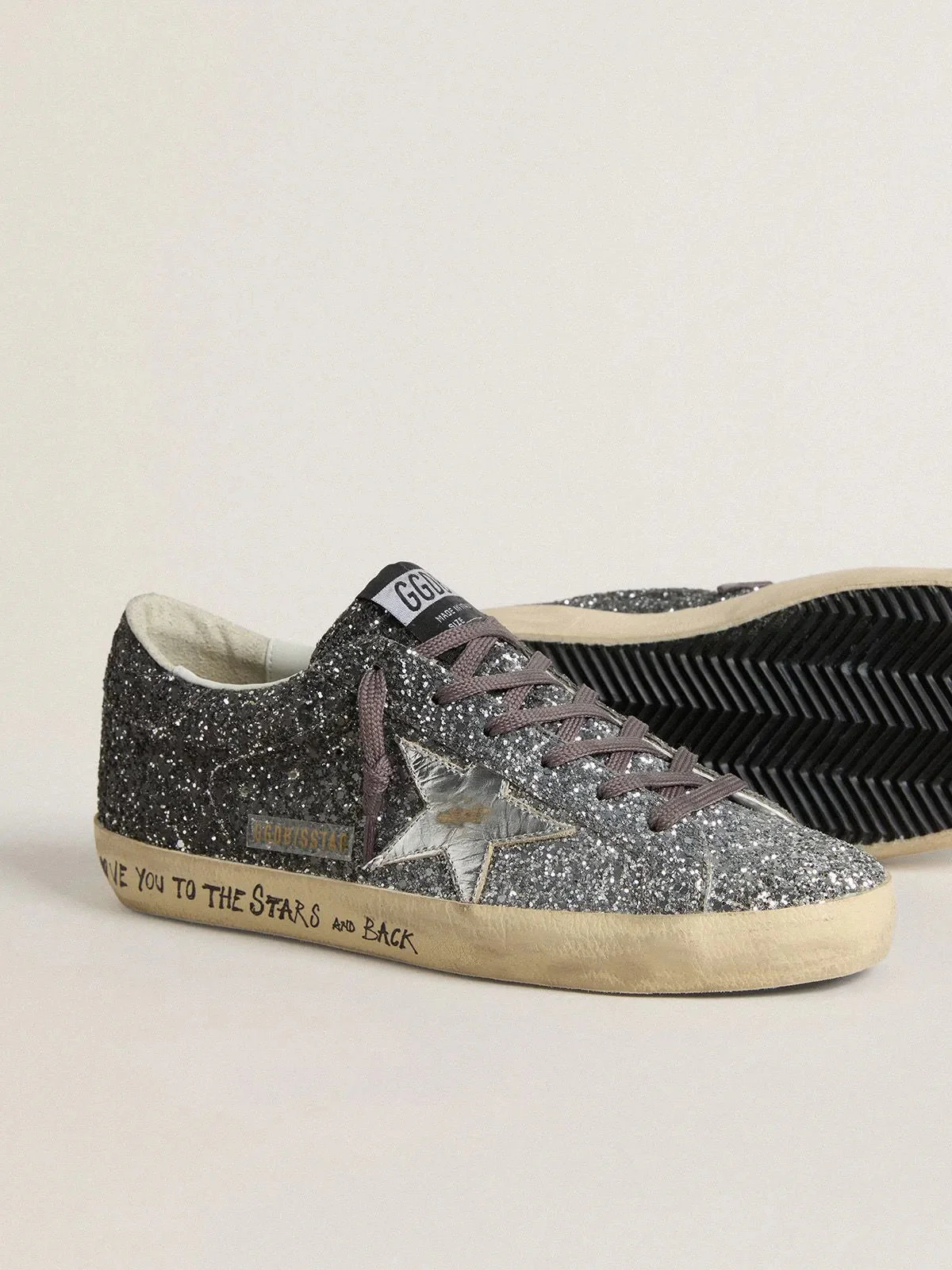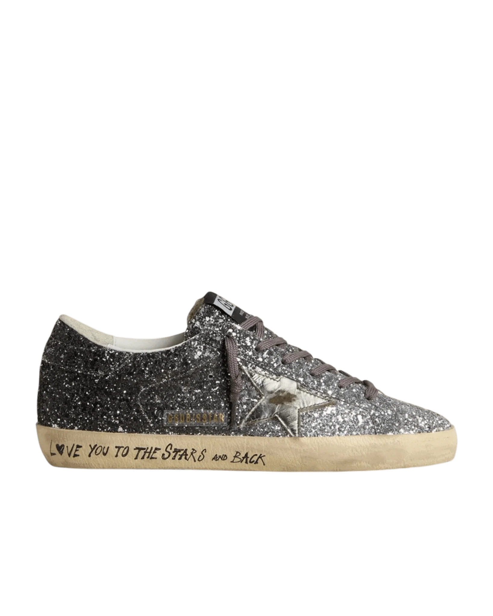 Une icône intemporelle, mais en constante évolution. Chez Golden, nous aimons reprendre nos classiques et les revisiter en permanence, toujours sous un nouveau jour. Dotées d’une tige à paillettes argentées à l’effet dégradé, ces Super-Star pour femme se distinguent par une étoile en cuir lamé argenté et par un contrefort à paillettes argentées. Les lacets gris anthracite et l’inscription « Love You to the Stars and Back » sur la bande de renfort complètent le style.