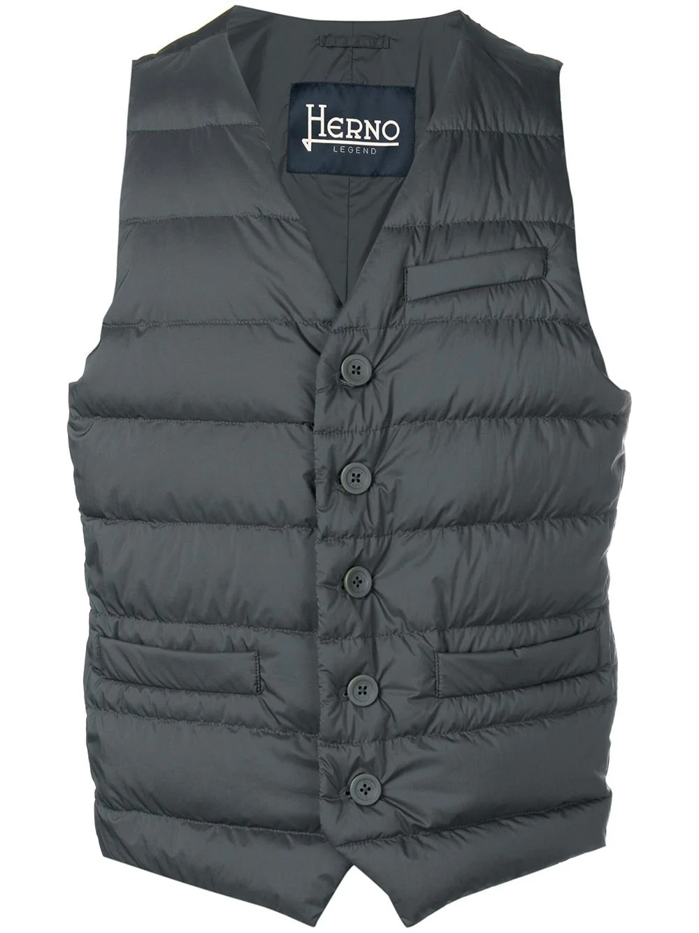 Gilet gris à design matelassé Herno avec col v, un design sans manches, boutonnière, coupe slim, poches latérales et design matelassé.