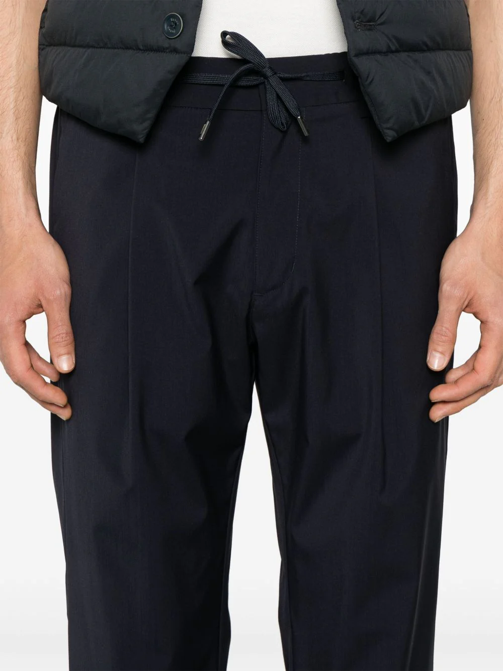 navy blue front press-stud and zip fastening elasticated drawstring waistband two diagonal pockets to the sides two rear welt pockets