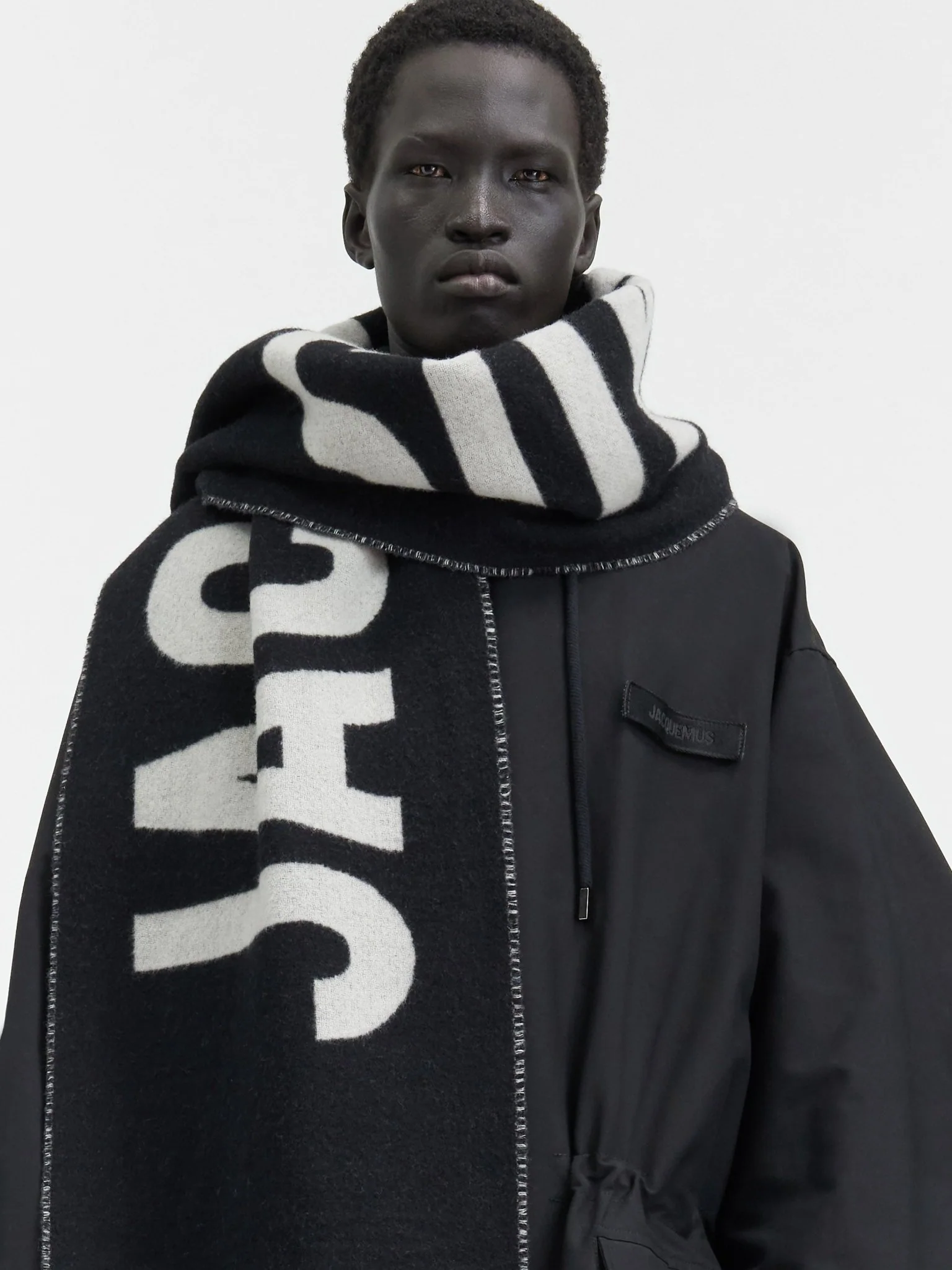 Écharpe frangée à logo – Echarpe à franges en laine– Fil de couleur unie– Logo Jacquard– Franges de 15 cm à chaque extrémité– 180 x 35 cm 100% Laine Pays de fabrication : Italie Ref. 226AC435-5007-990