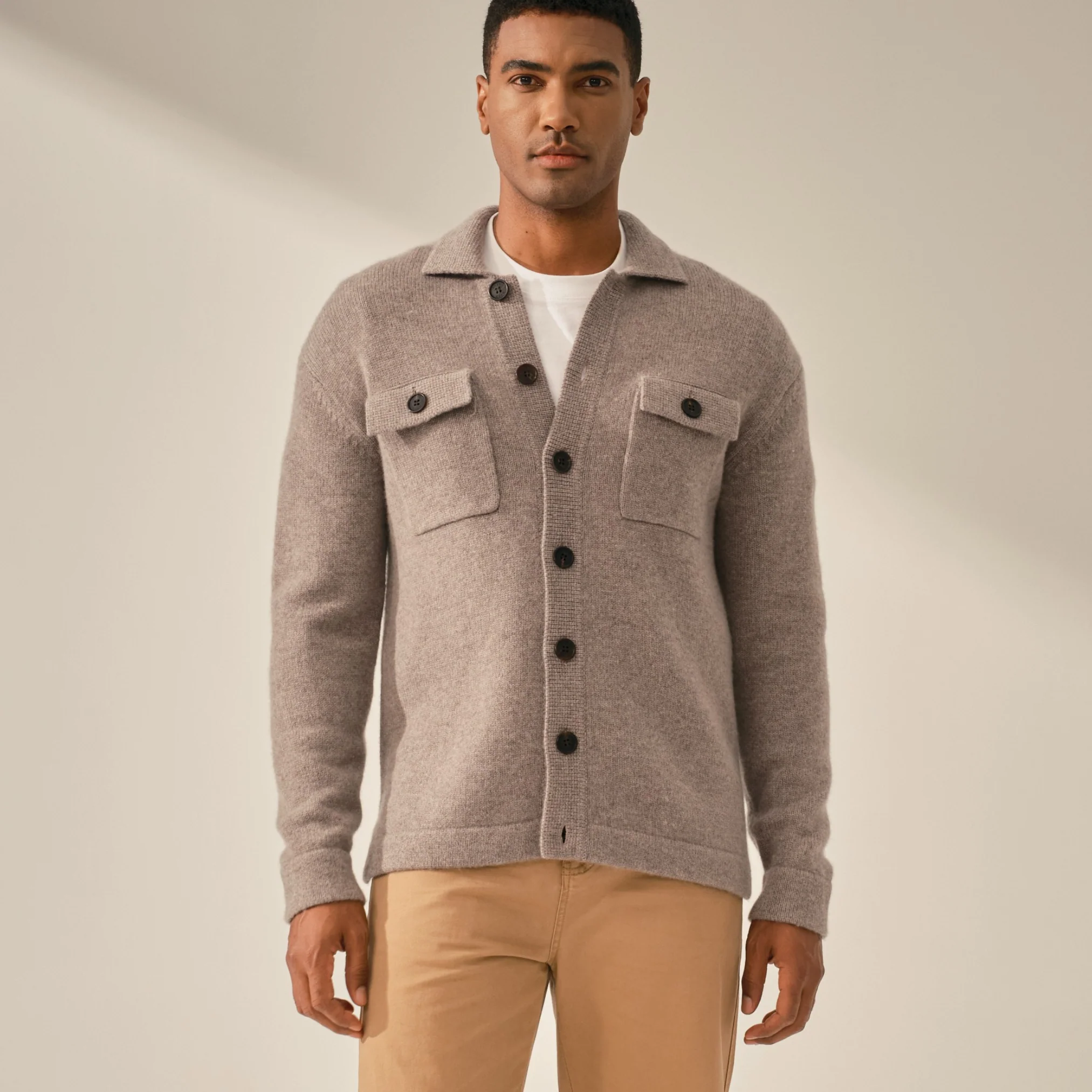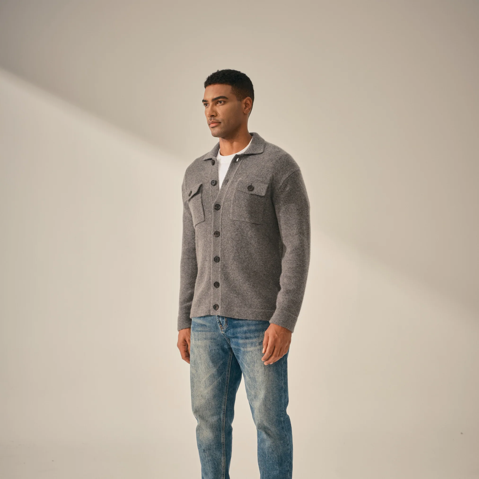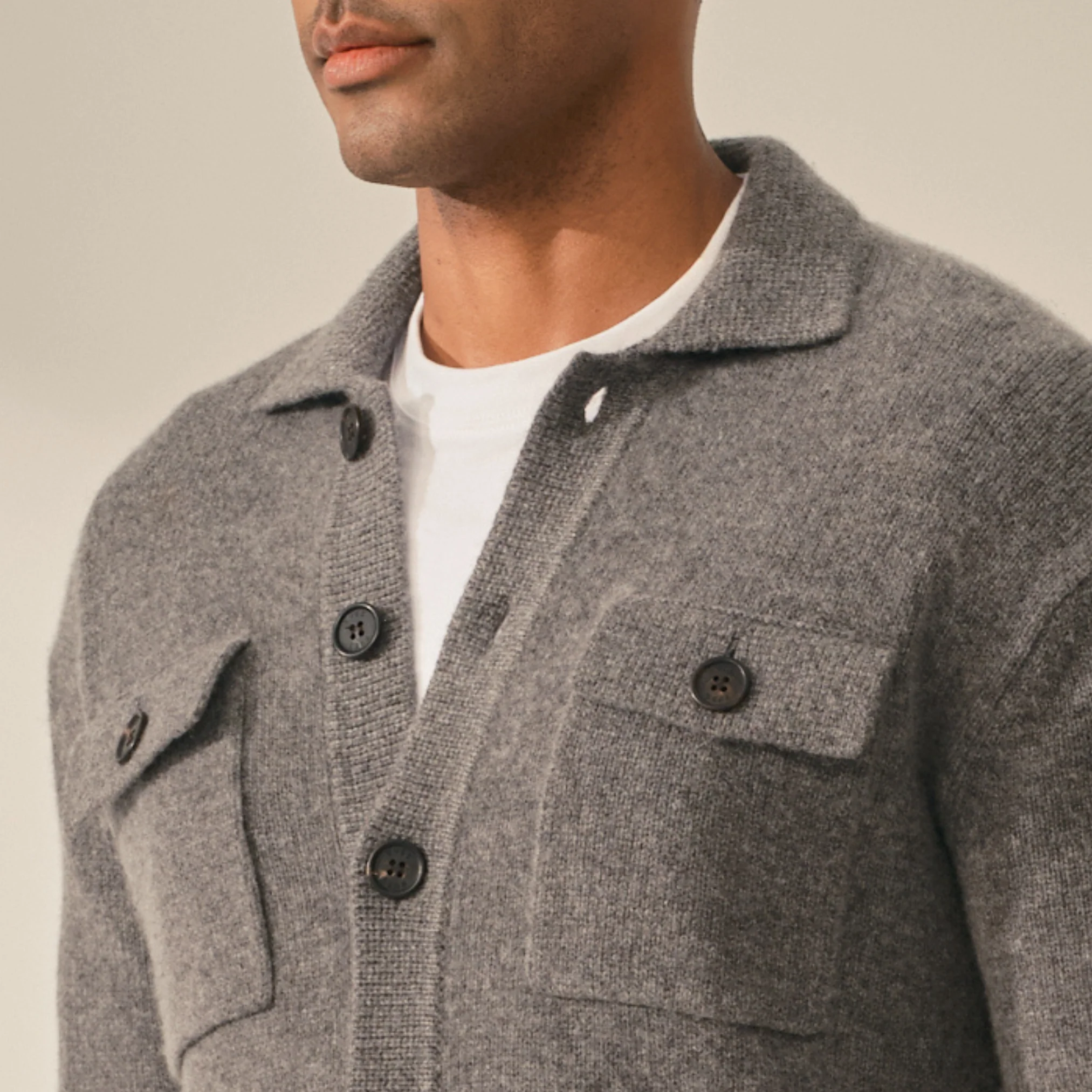 Découvrez notre collection de mailles 100% cachemire, de Mongolie Intérieure. Ici, le cardigan type « veste de travail ».