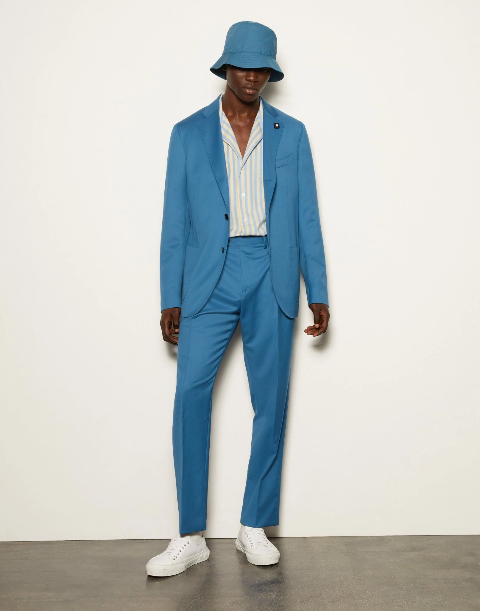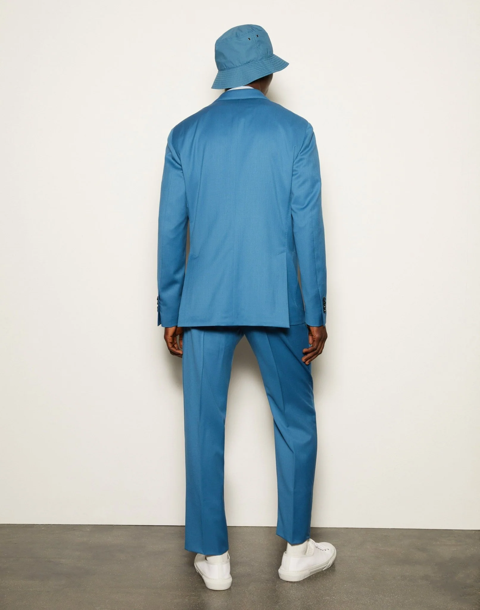Le bleu clair choisi pour ce costume est tout à fait surprenant. La veste non doublée présente trois boutons (dont un faux), des poches plaquées et des fentes latérales. Les épaules sont naturelles et regular.